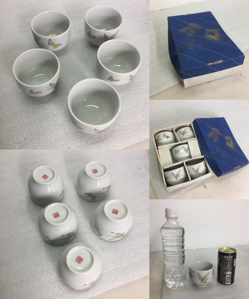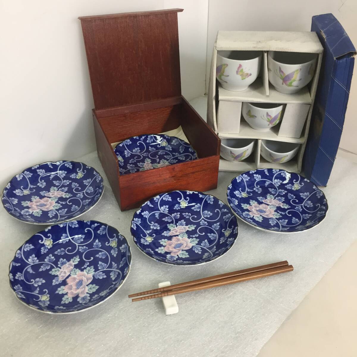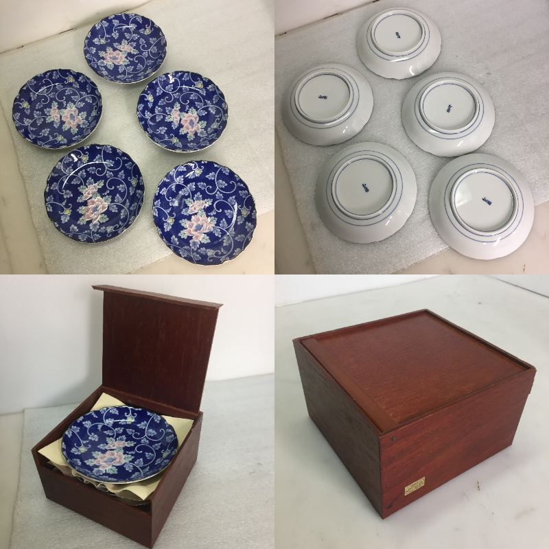 | □【未使用品保管品】丸皿&湯呑 セット 各5客 有田焼 和光園&豊秀 青&白 木箱付き 華&蝶 食器 皿 茶器 まとめ売り 【現状渡し】 | |
