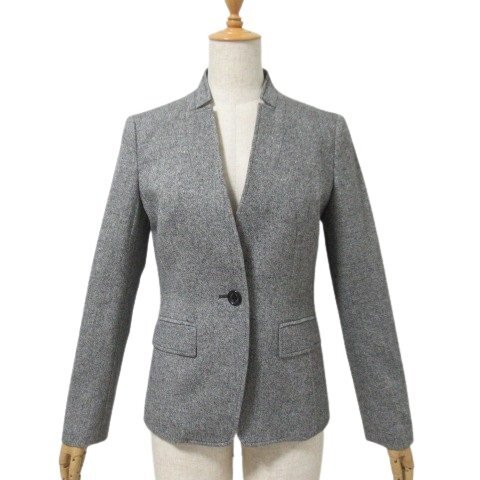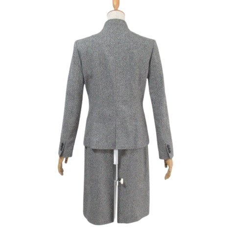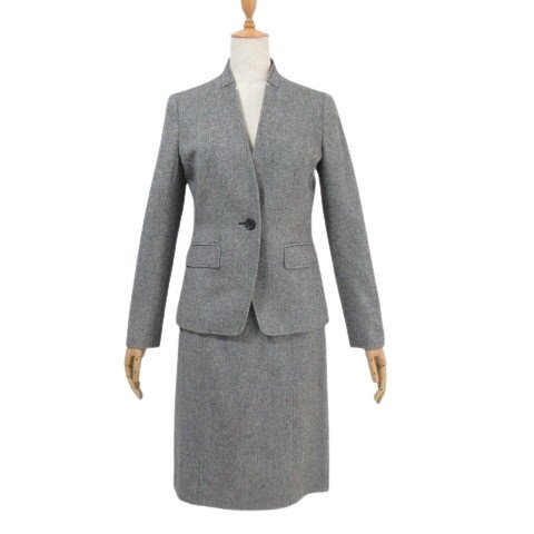 【商品説明】秋冬に着られるウール混のセットアップです。全体にさりげなくラメが入っていますが、ギラギラした感じはなく、上品な印象です。ビジネスやフォーマルなど様々なシーンに最適です。・生地の厚さ:やや厚地・透け感:なし・伸縮性:なし・肩パット:あり(薄め)【状態】美品です。特筆するダメージはなく、全体的にキレイな状態です。中古品につき、多少の毛羽立ちや目立たない程度のダメージはご了承ください。【サイズ】ジャケット:4(7号/S)・着丈 56.5cm・肩幅 38cm・身幅 45.5cm・袖丈 59.5cmスカート:4(7号/S)・着丈 55.5cm・ウエスト幅 約33.5cm・ヒップ幅 約45cm【カラー】グレー系【素材】素材タグ画像参照【仕様】ジャケット・前身頃:ボタン1個のみ・ポケット×2【付属品】なし【商品番号】1230_8【注意事項】※商品の状態、色味などは当店の判断によるものです。※あくまでも中古品につき、些細なダメージや見解の相違による返品はお受けできません。※サイズはすべて平置きでの実寸です。多少の誤差はご了承ください。※気になる点がございましたら、入札前にお問い合わせください。※お取引に関する詳細はストア情報でご確認ください。