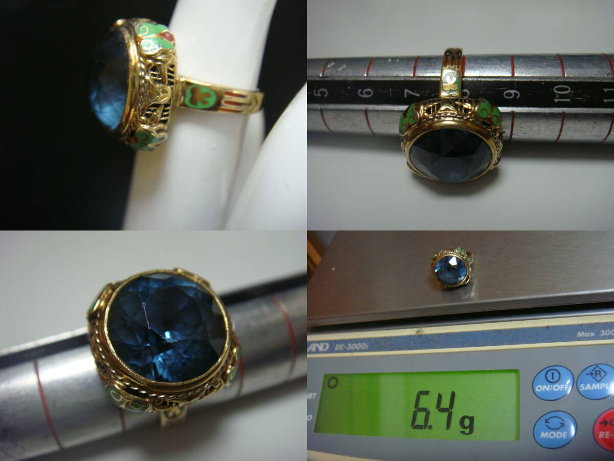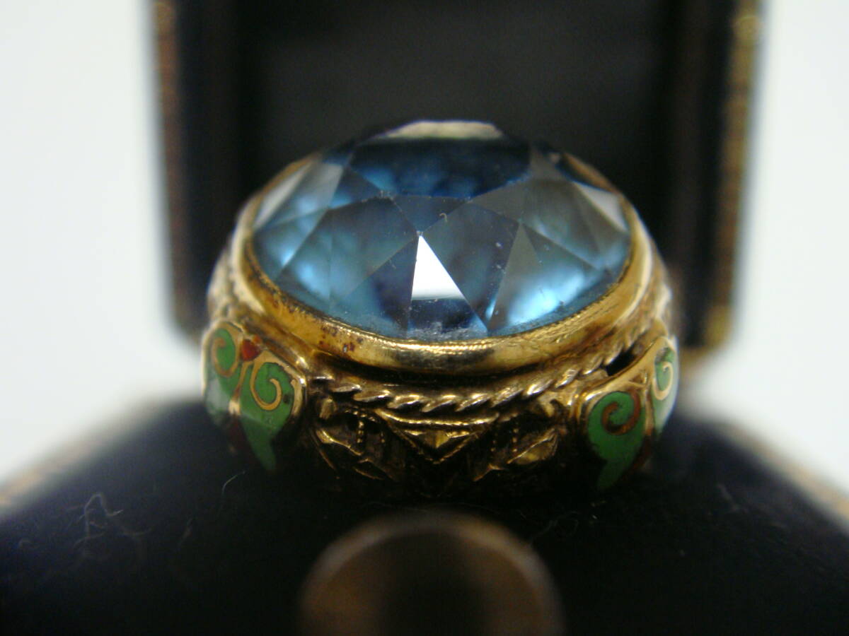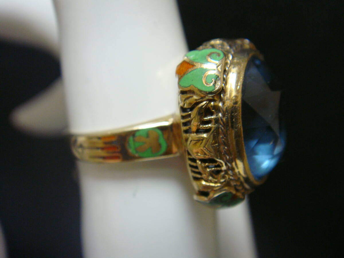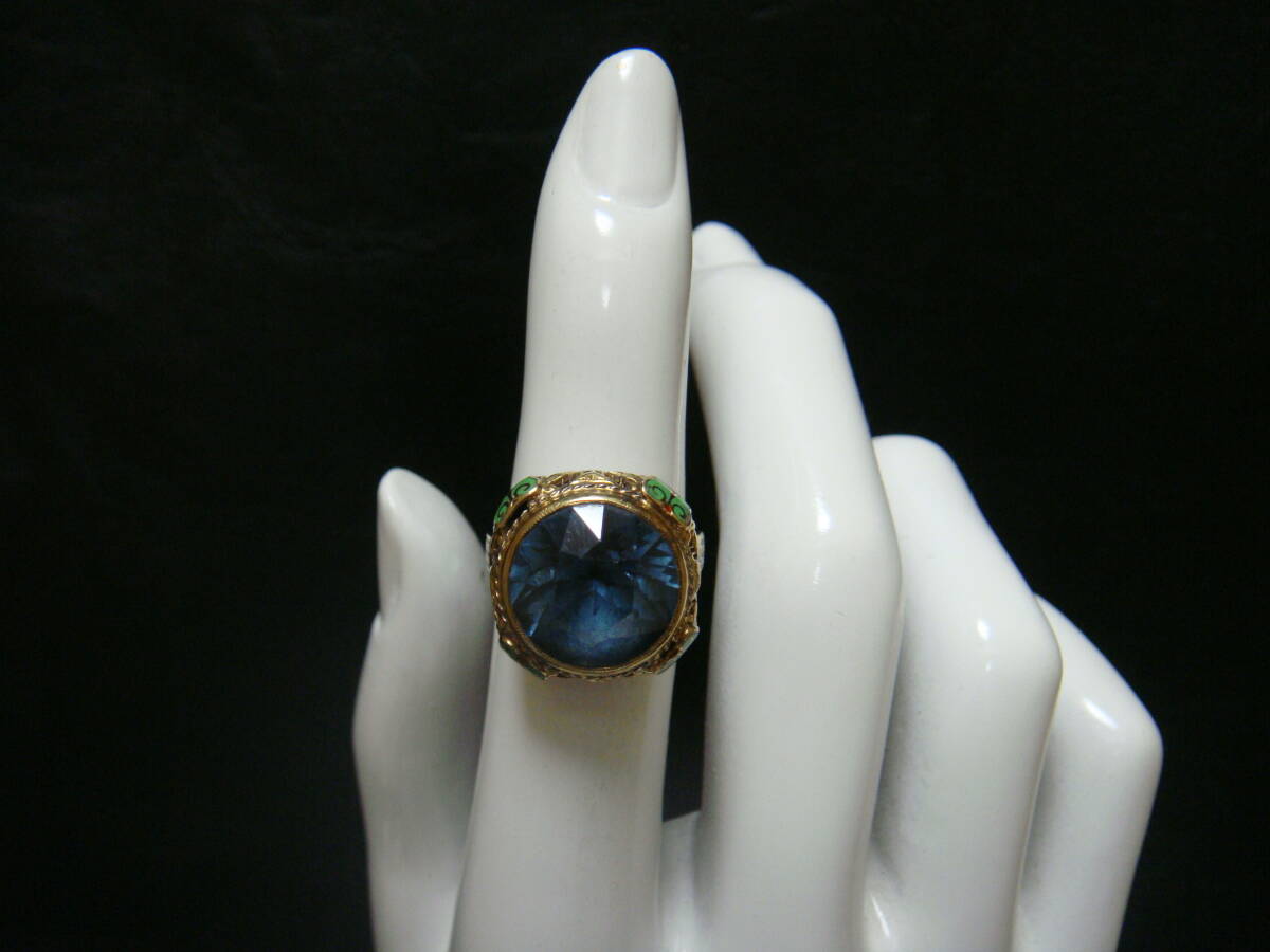 出てきたままの状態です。アンティークな青色石とエナメルで装飾されたリングです。サイズは約8です。