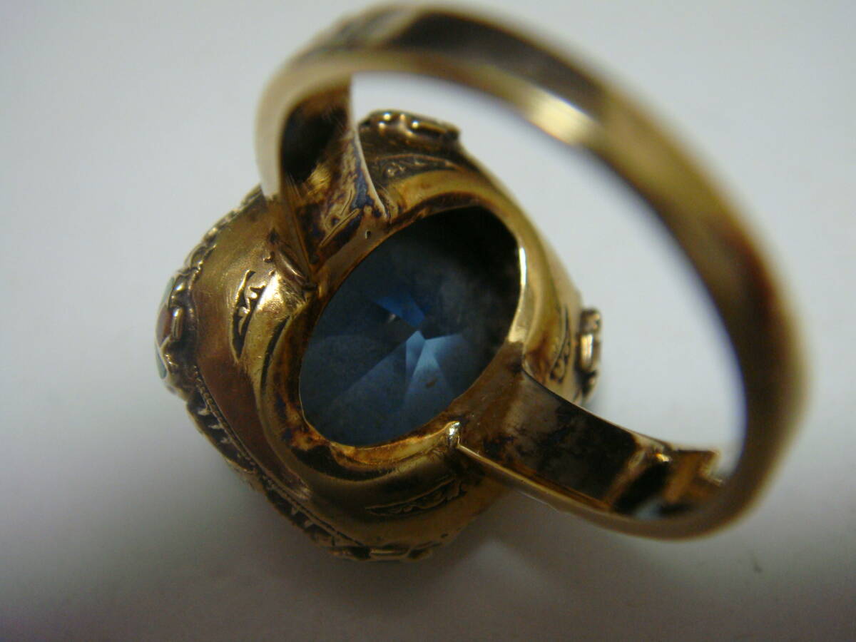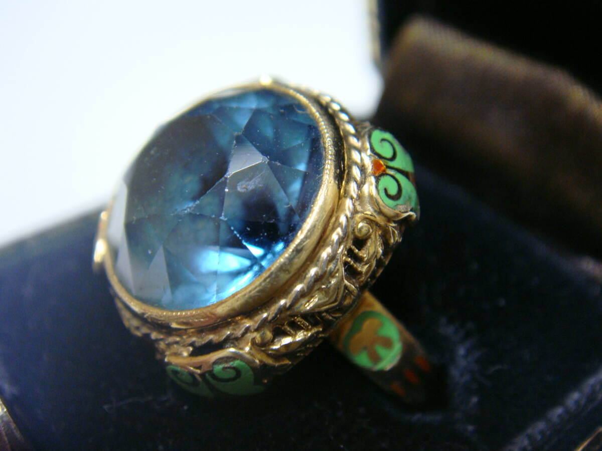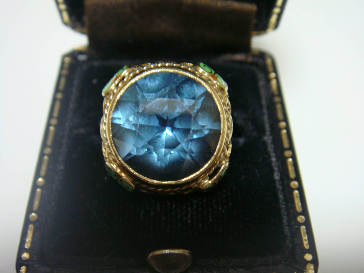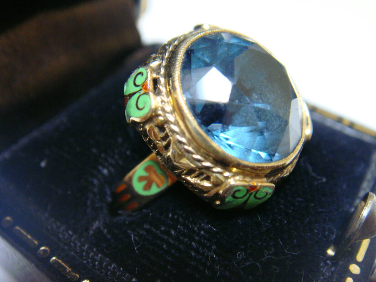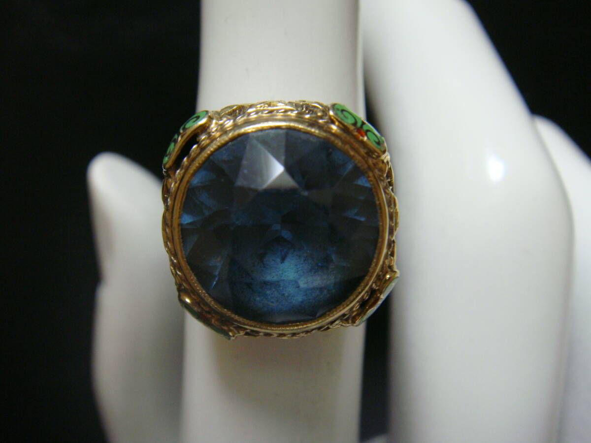 出てきたままの状態です。アンティークな青色石とエナメルで装飾されたリングです。サイズは約8です。