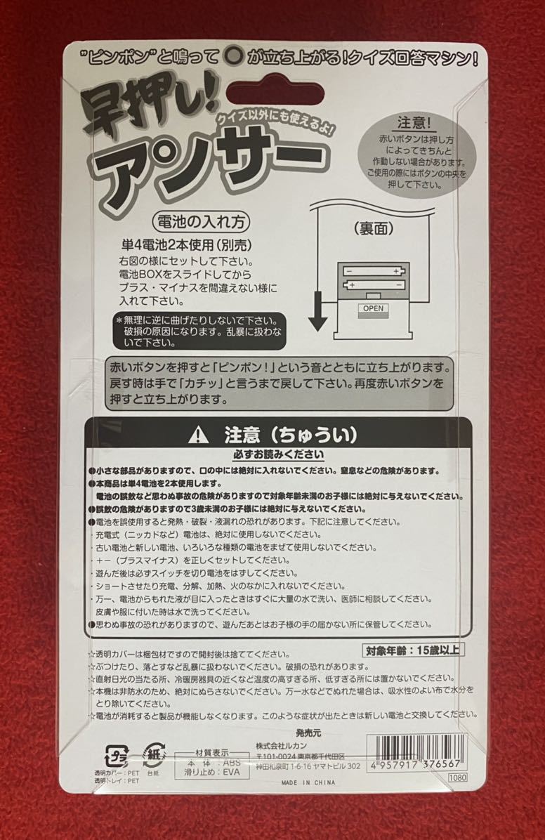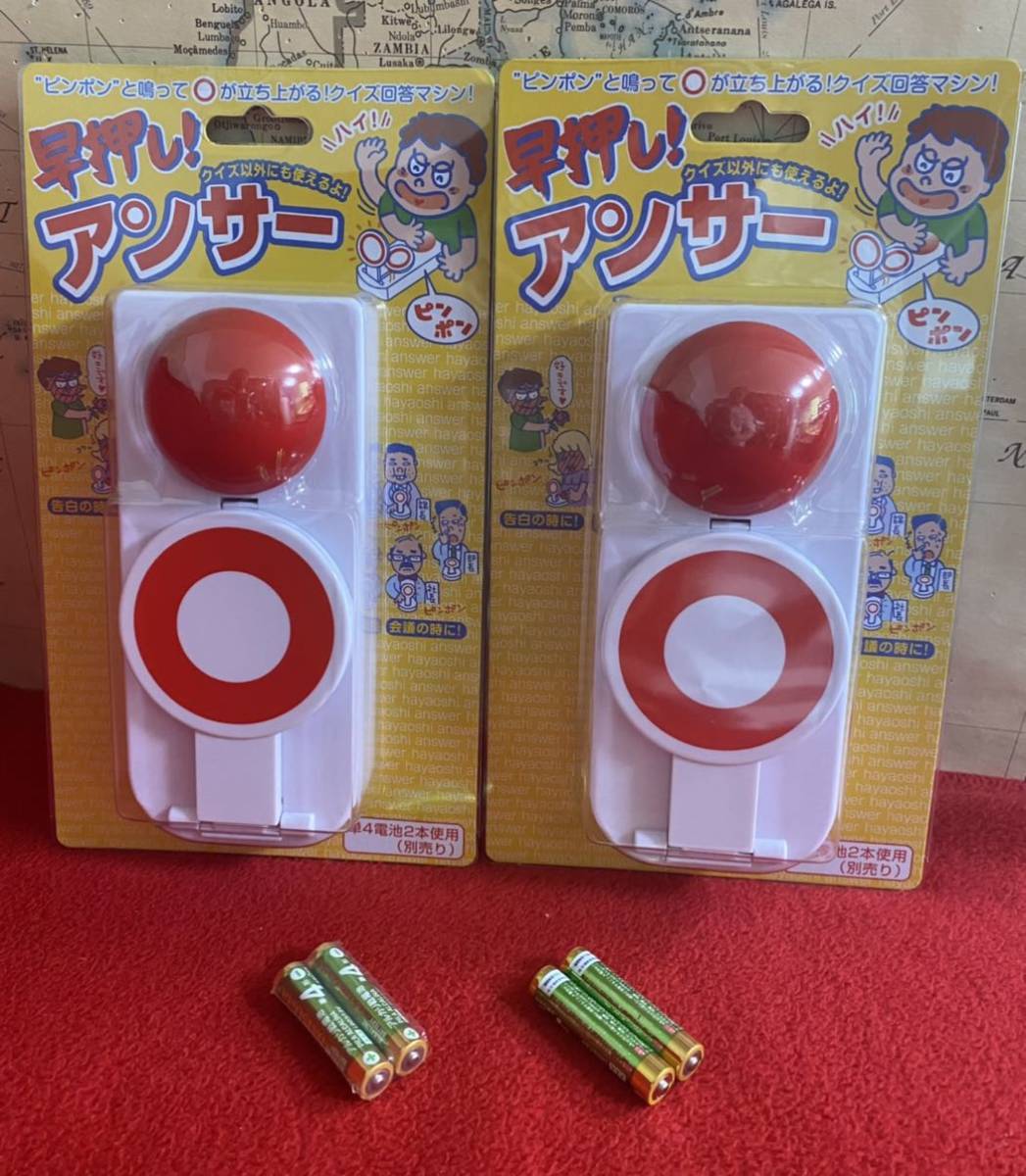 イベントやパーティー、宴会などで クイズ余興などで 採用していただければ効果的です ポンと立ち上がる:早押しアンサー 電池付 まとめて2台セットの出品です 早押しアンサーは回答者が主に使います ピンポンと鳴って○が立ち上がるクイズ回答マシン 本体サイズ70*160*30mm パッケージサイズ135*235mm 単4電池4本付属の2台セットお値打ちセットです 動作確認の上お届け致します 楽しいパーティーを盛り上げてゆきましょう 新品 未使用 お値打ち価格でお届け致します 定形外配送料¥510にてお届けいたします。 尚 この商品には希望落札価格が設定されております。出品商品につきまして わからない事のある場合 お気軽にご質問欄にて ご投稿下さい 迅速に ご返答差し上げます 『ご落札前に私の自己紹介欄を 必ず! ご参照下さいませ 休日情報など最新の情報を掲載しています *お取り引きに関しましての お願いです オークションのルールに従い 宜しくお願い致します*』