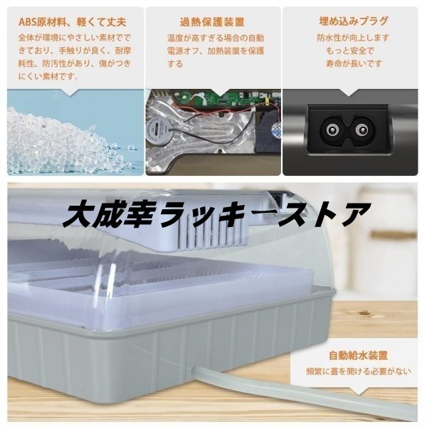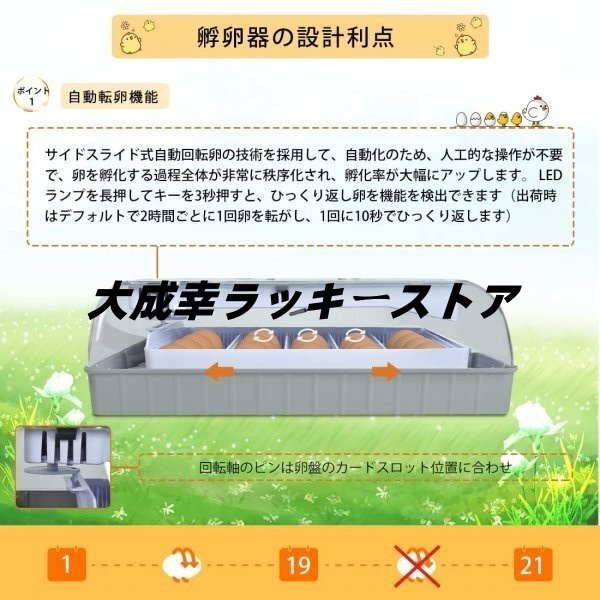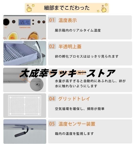 【孵卵器★良いデザイン】①蓋が半透明の状態:卵の孵化プロセスははっきり見られます。②温度センサー装置:箱内の温度を監視します。③排水穴の設計: 水量が高すぎると自動的にあふれ出し、卵が水に触れないようにします ④グリッドトレイ:空気循環を確保し、掃除が簡単 。⑤埋め込みプラグ、防水性が向上します。もっと安全で、寿命が長いです。⑥専用泡パッケージ:専用泡パッケージもっと視覚化と操作性が実現されています。