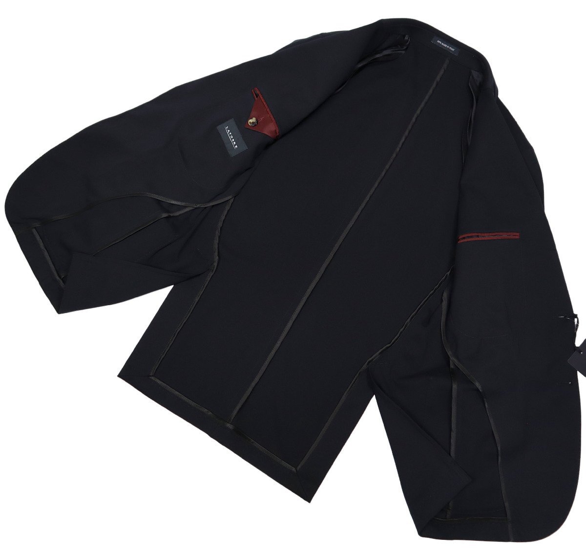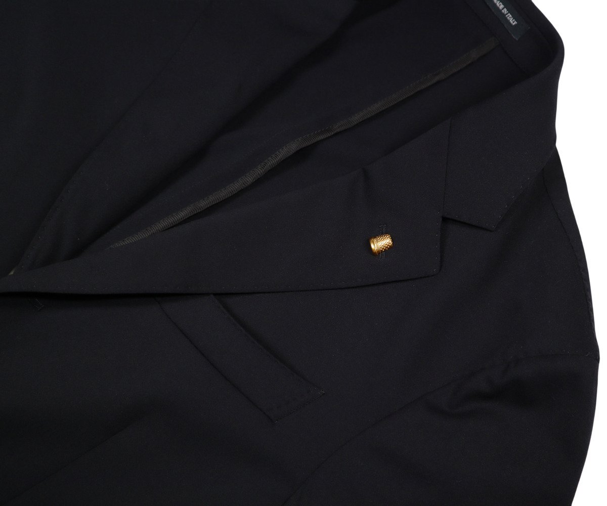 シングルブレスト段返り3ボタン 袖4ボタン(未修理) 胸・バルカポケット 腰・パッチポケット(なべ底型) 襟裏・ヒゲ付き 本水牛ボタン 内ポケット2つ(ボルドーパイピング仕様) 大見返し仕上げ 内側・パイピング仕様 額縁仕上げ ハンガーループ(「100% MADE IN ITALY」刻印) 一枚仕立て ゴールドピンズ付き(着脱可能) サイドベンツ