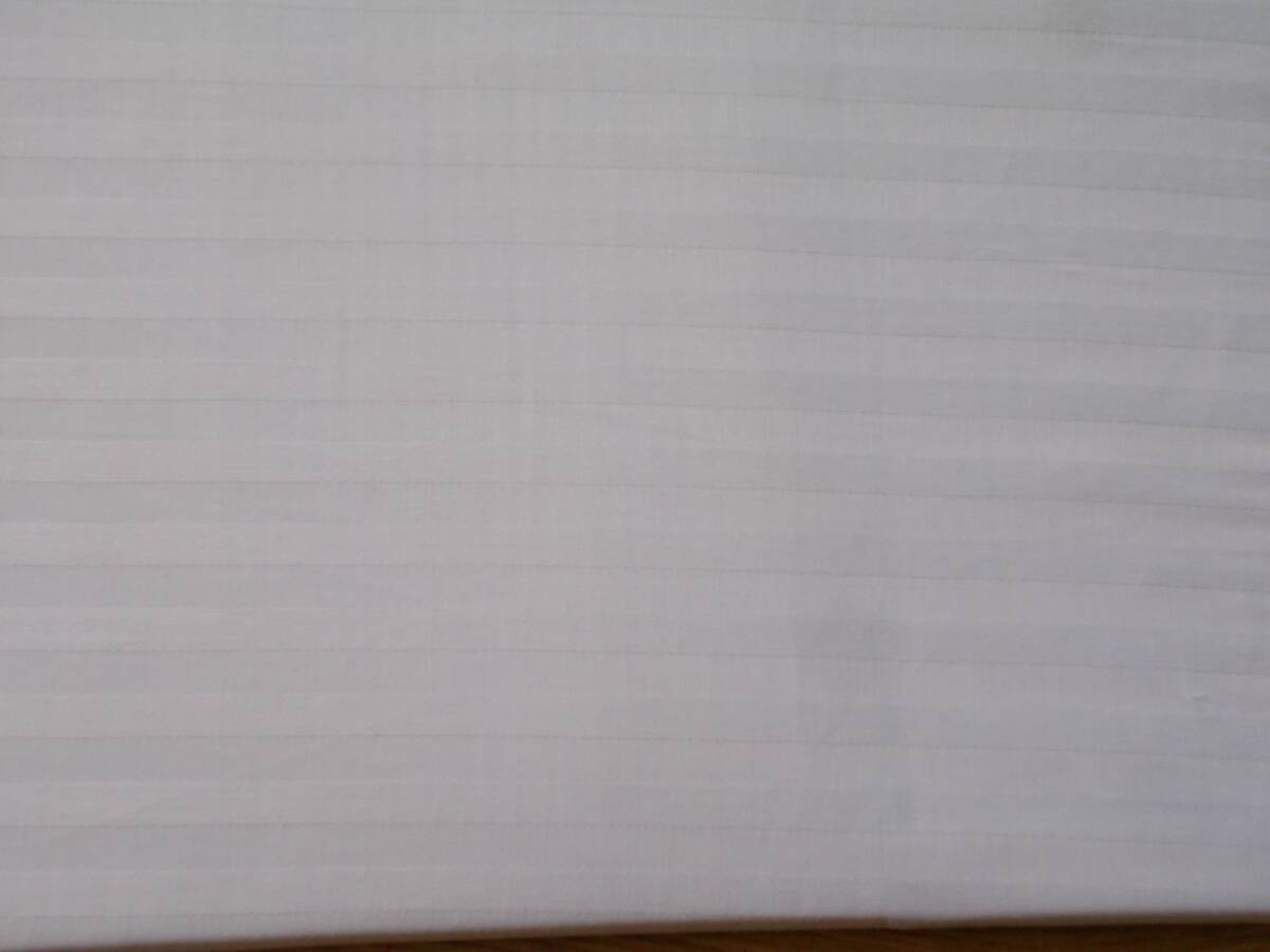 比較対象として、ぺらぺらなポリエステル80%、綿20%生地と普通ランクの綿100%の生地を画像で上げています。ポリエステル生地は薄いので蛍光灯がはっきりと見えますが、綿100%生地は蛍光灯がぼやけています。比較で写真を撮った綿100%のボックスシーツはこのサテンストライプより2ランク程度安い綿100%のボックスシーツです。