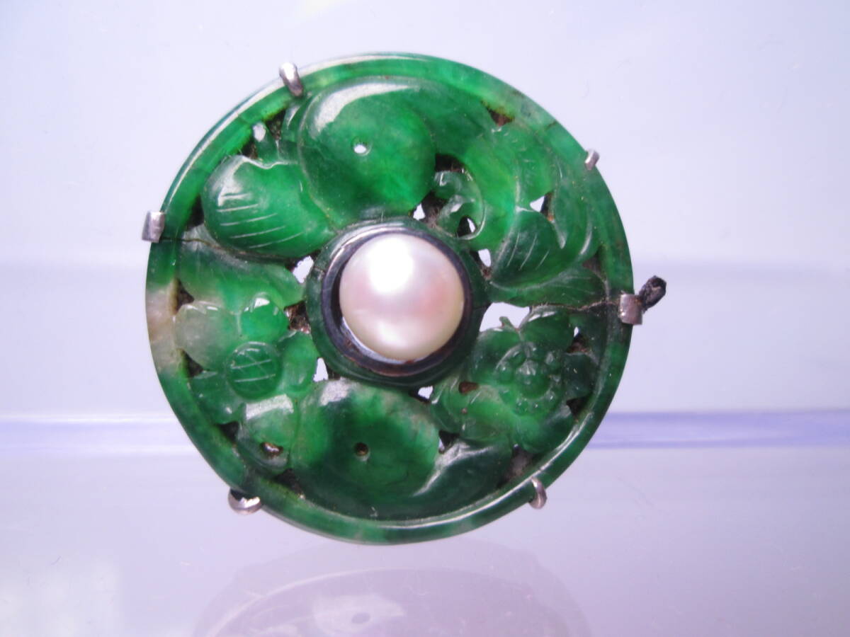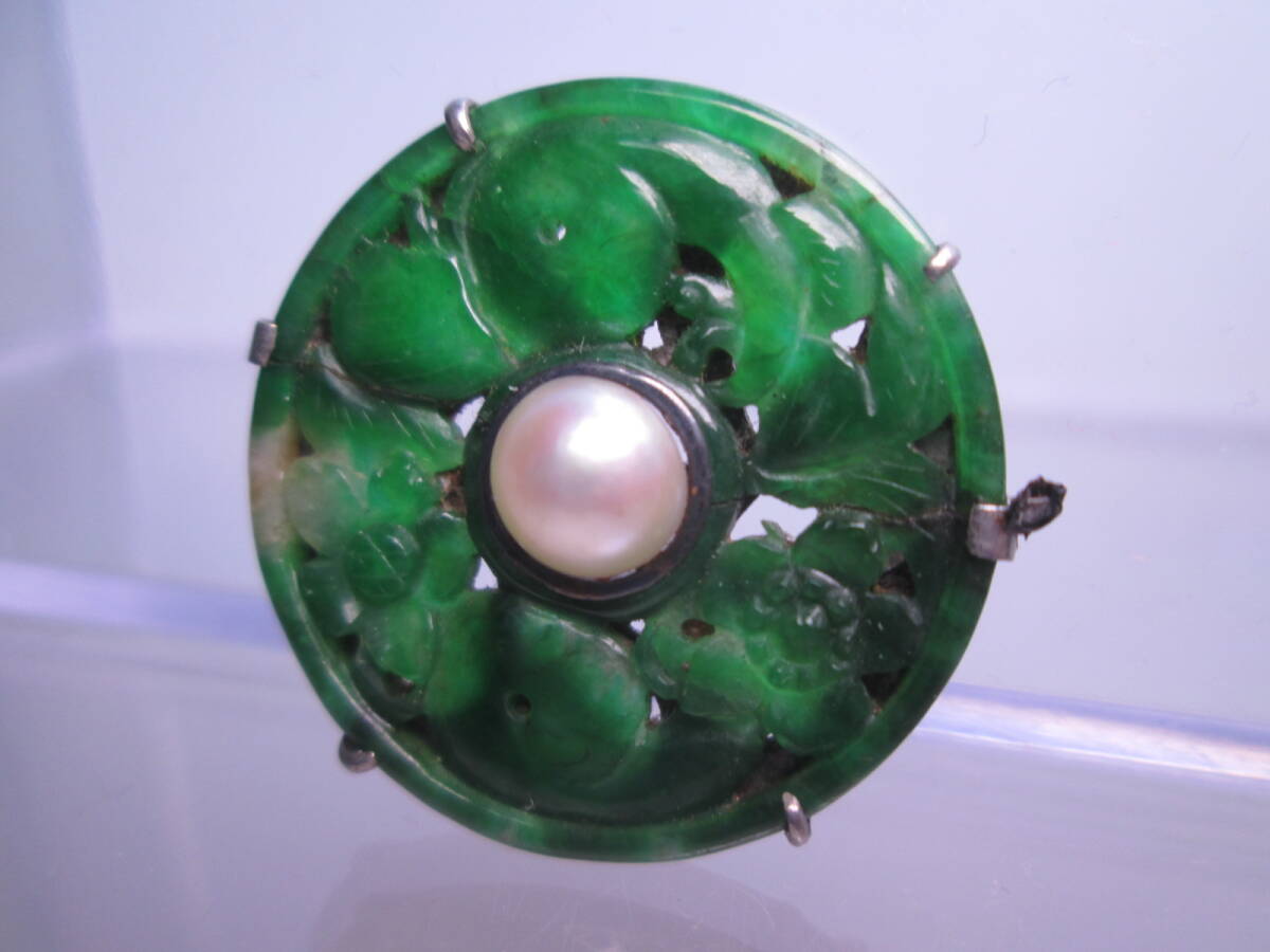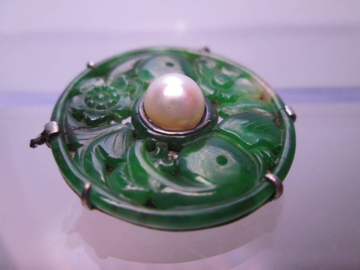 【江月】アンティーク・本真珠飾り 本翡翠 花と実透かし彫刻の帯留め 3,98g