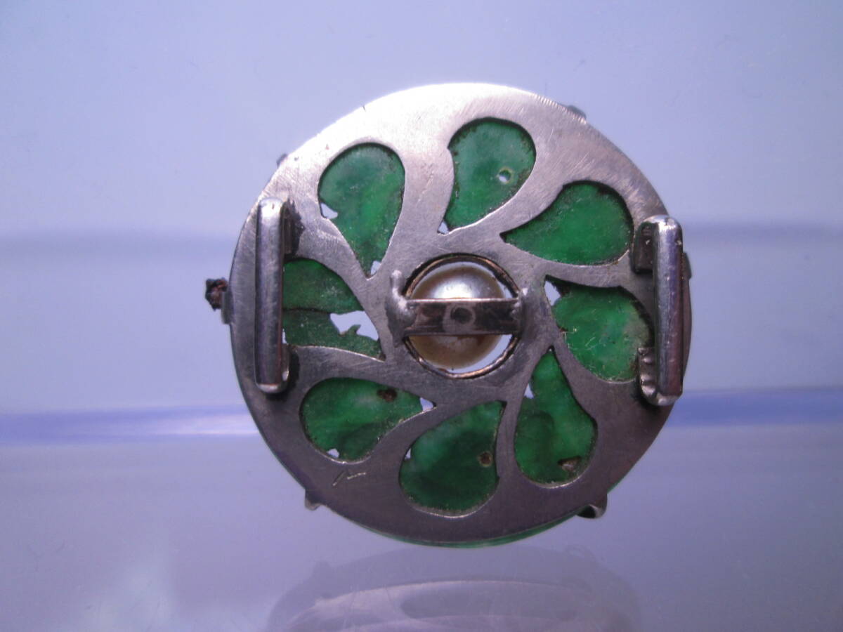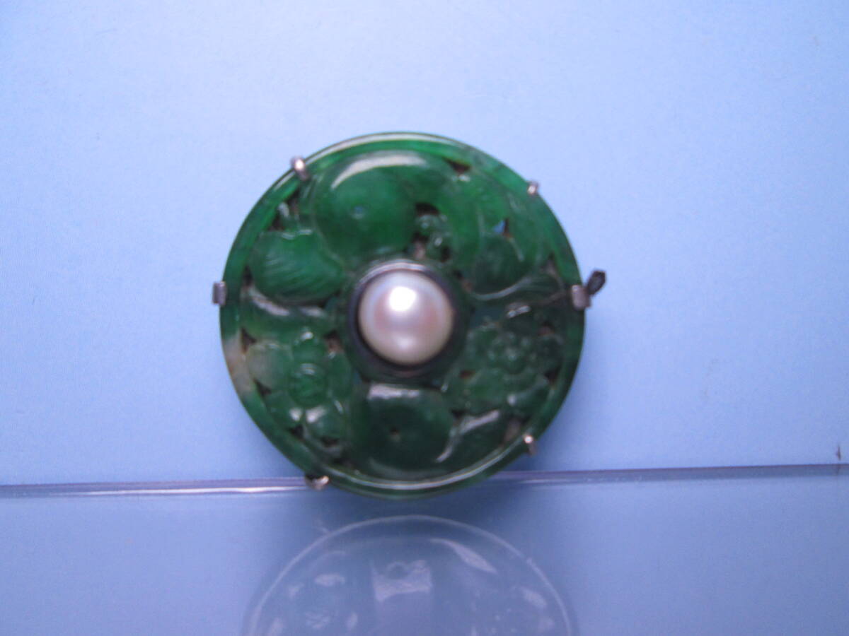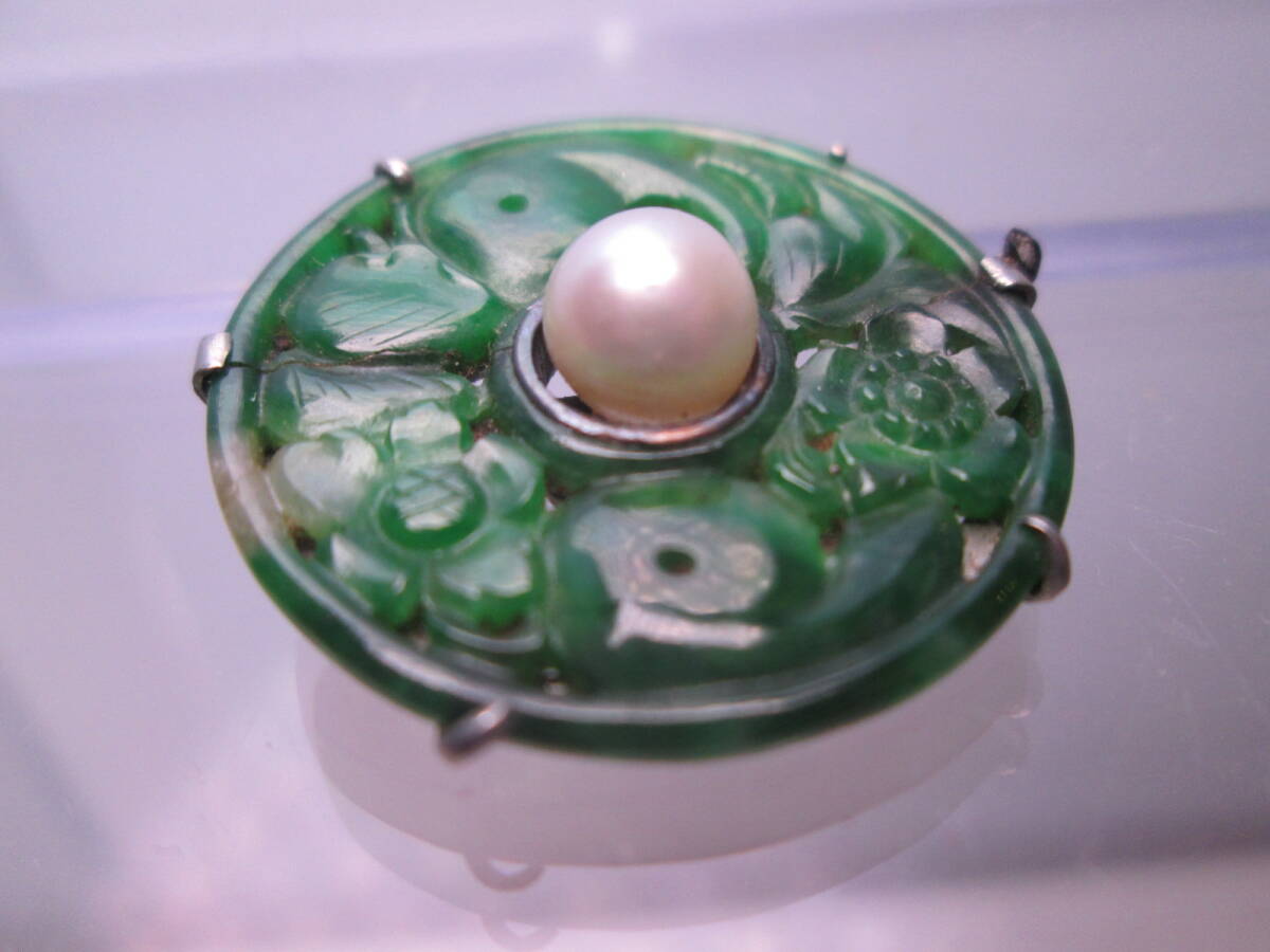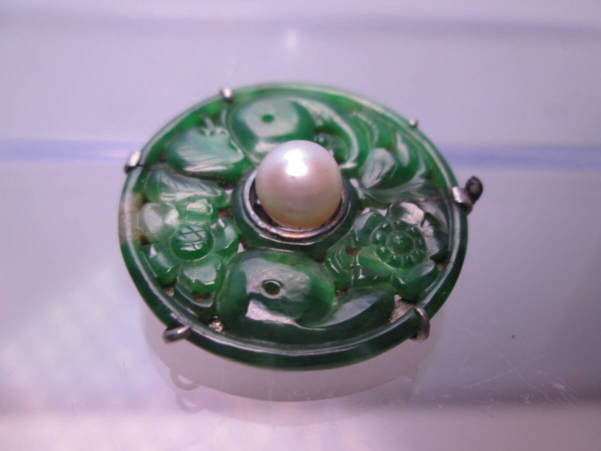 【江月】アンティーク・本真珠飾り 本翡翠 花と実透かし彫刻の帯留め 3,98g