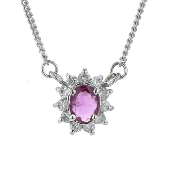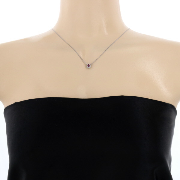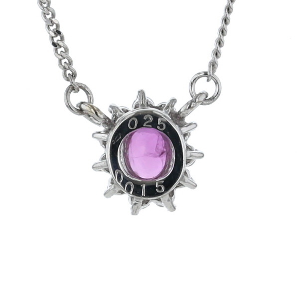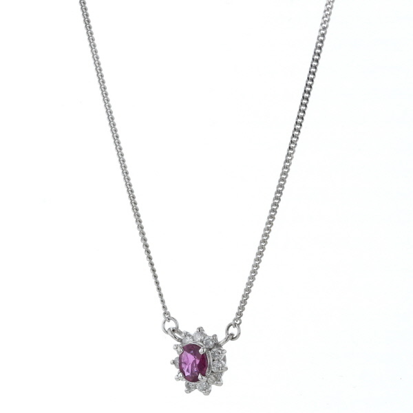 | 商品紹介 | 鮮やかな紫色のルビーと脇石のダイヤモンドが上品なプラチナネックレスです。 |