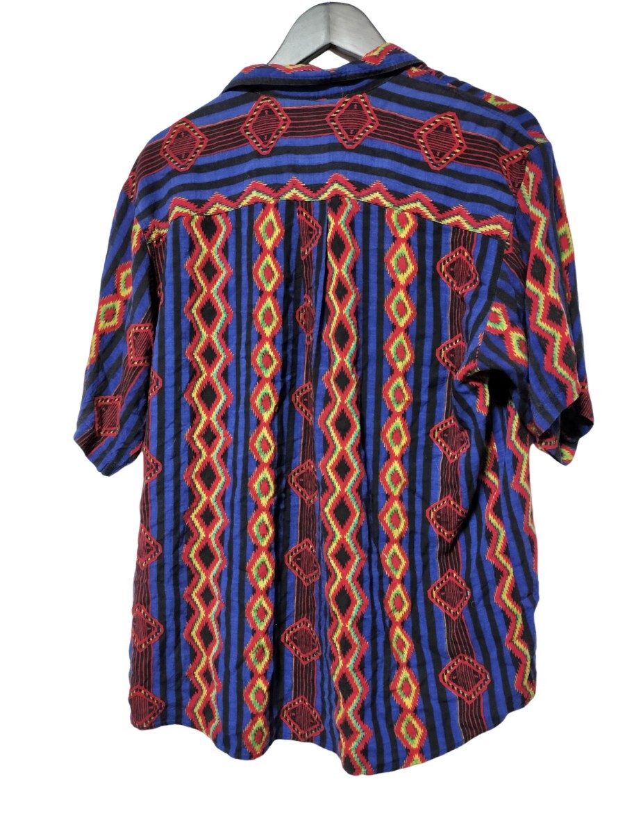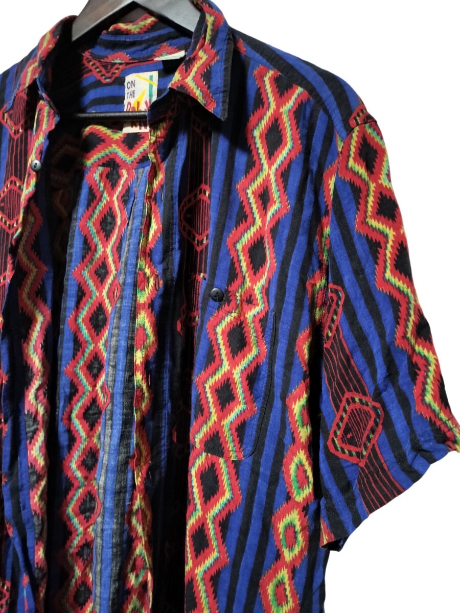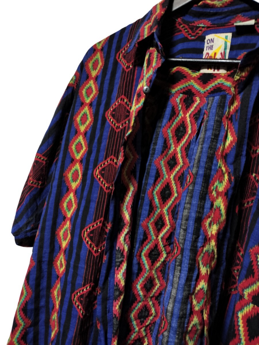 艶やかなブルーにレッドとイエローのジグザグ柄が映える、メキシカンスタイルのヴィンテージシャツ。