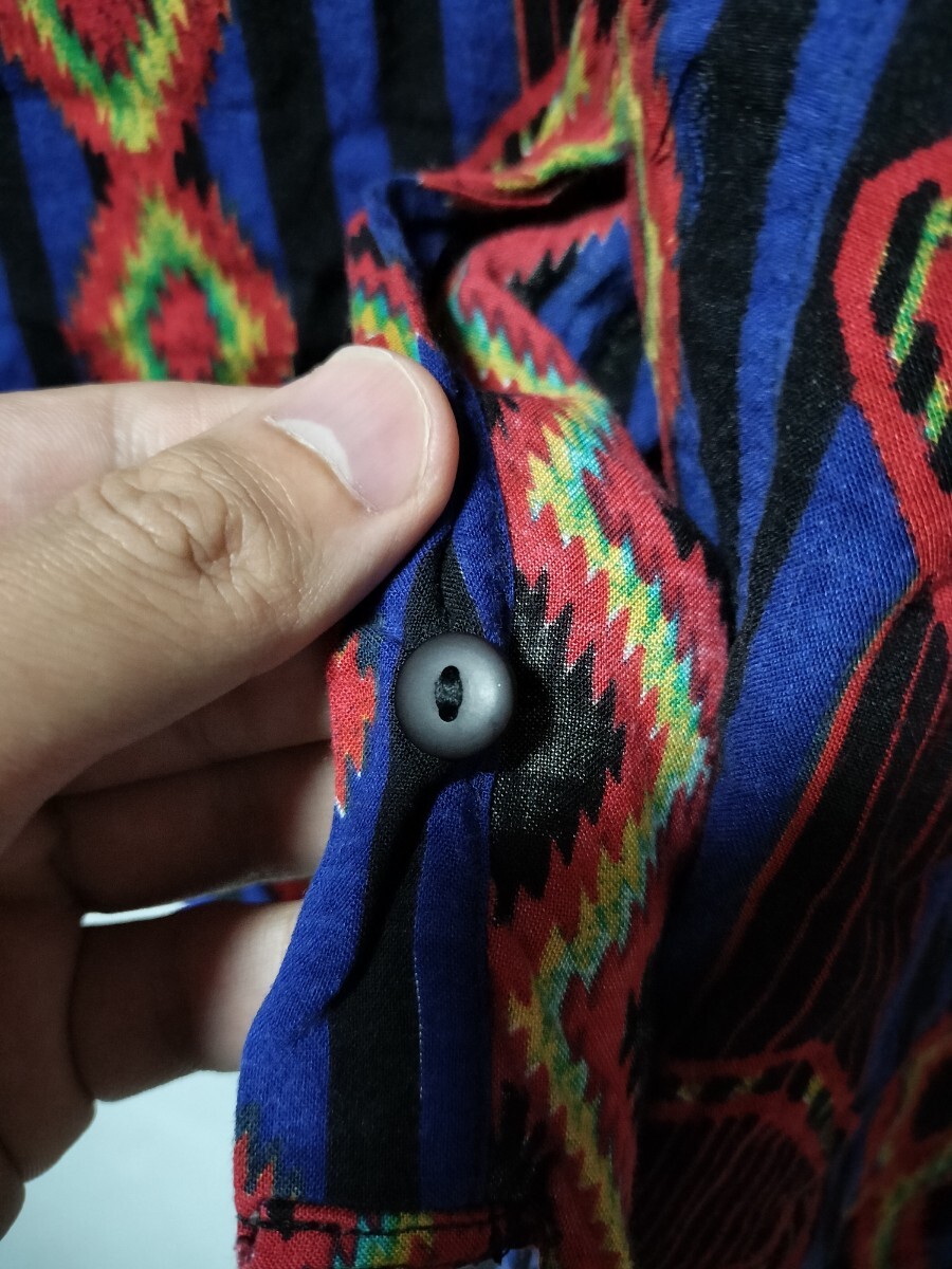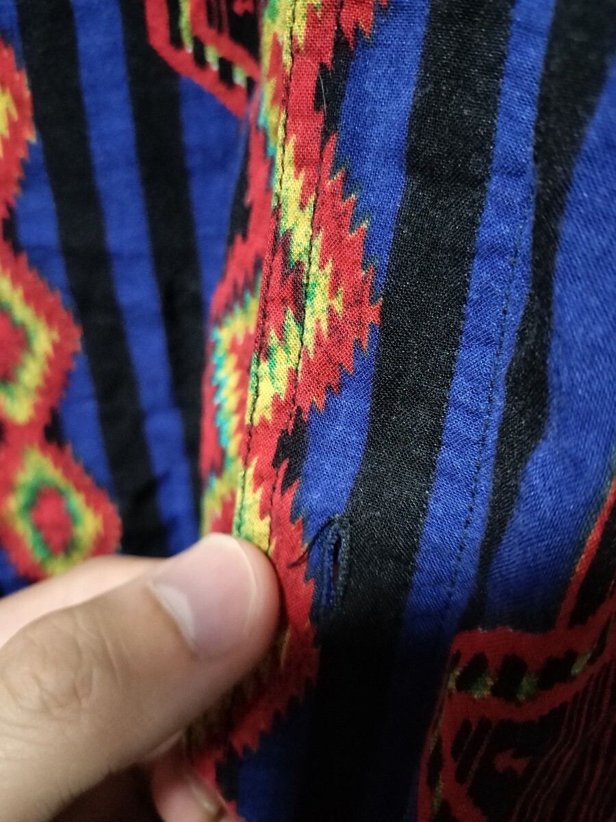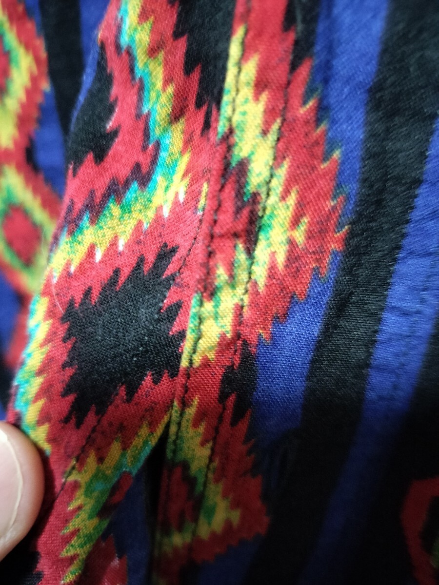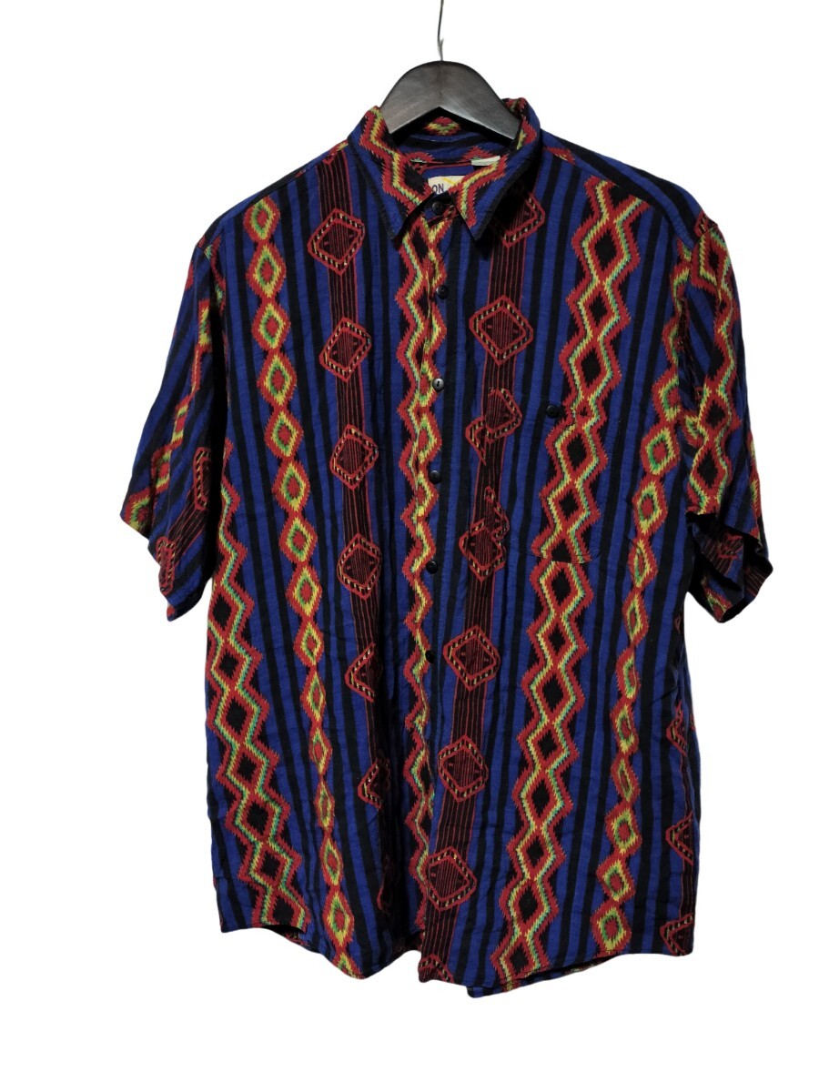艶やかなブルーにレッドとイエローのジグザグ柄が映える、メキシカンスタイルのヴィンテージシャツ。