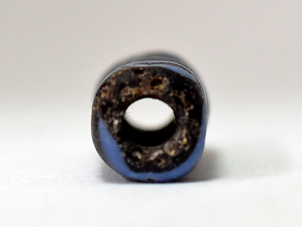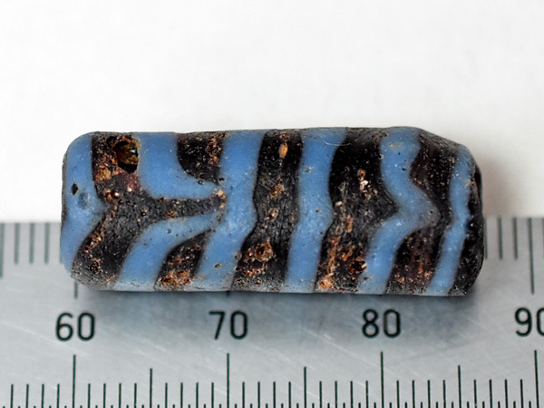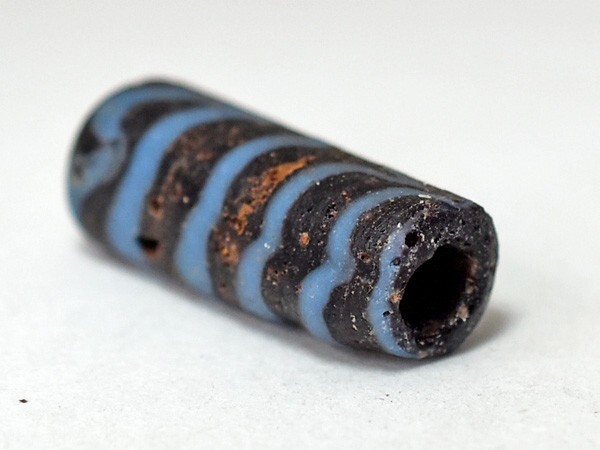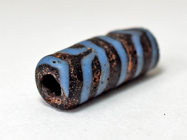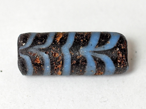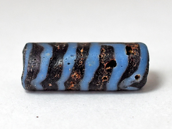 アフガニスタン周辺から出土した、水色の羽模様があしらわれたイスラムビーズです。長めの丸管型で漆黒のボディとのコントラストもいいです。状態は概ね良好です。