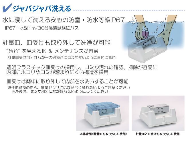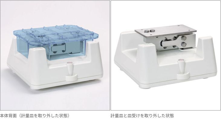| 計量皿、皿受けも取り外して洗浄が可能 "汚れ"を見える化&メンテナンスが容易 計量皿受け部分は万が一の破損時に見えやすいように青色に着色 透明プラスチック皿受けの採用し、ゴミや汚れの確認、掃除が容易に内部にホコリやゴミが 溜まりにくい構造を採用皿受けは簡単に取り外して内部を水洗いすることが可能 ※性能維持のため、質量センサにはなるべく触れないようご注意ください。 洗浄後は、センサ部分に水が残らないようにしてください |