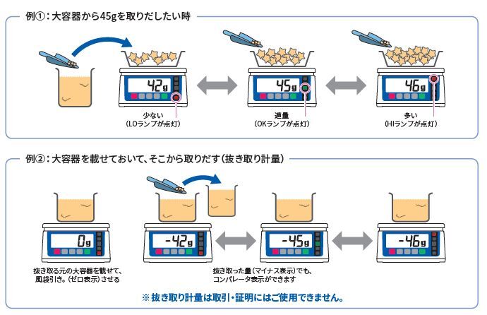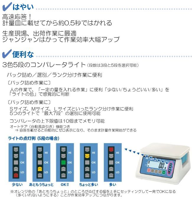 | 便利な3色5段のコンパレータライト(段数は3段と5段を選択可能) パック詰め/選別/ランク分け作業に便利 ・パック詰め作業に 人の作業で、「一定の量を入れる作業」に便利「少ない/ちょうどいい/多い」を 「ライトの色」で感覚的に判断 ・ランク分け作業 Sサイズ、Mサイズ、Lサイズといったランク分け作業に便利 5つのライトで“最大7段”の選別に 使用可能 コンパレータの上下限値は10個までメモリ可能 オートテア(自動風袋引き)機能つき ⇒ 容器を載せると自動的にゼロ表示になり、そのまま計量 作業開始ができる |
