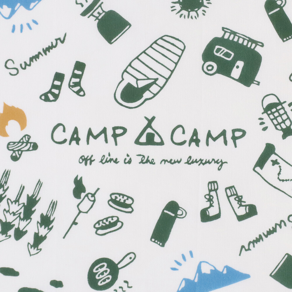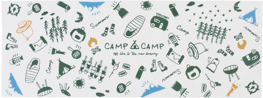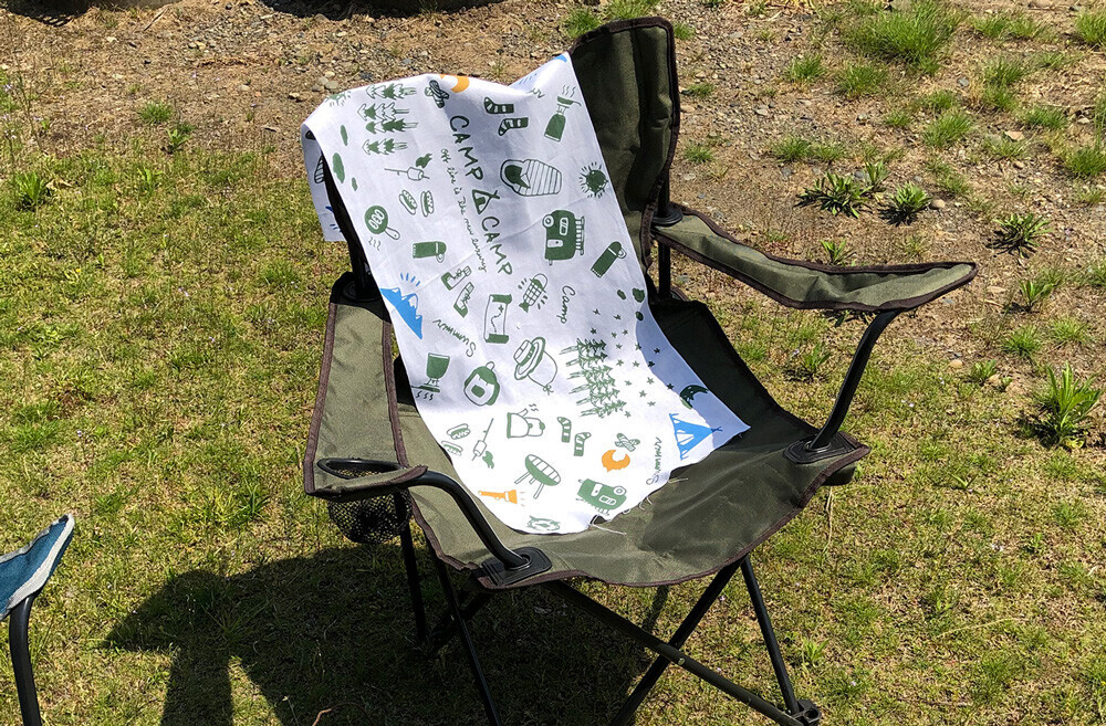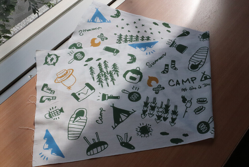 楽しいアウトドアの一場面を手ぬぐいの柄にしました。ランタン、寝袋、焚火、グリル、バーナー、キャンプカー……。