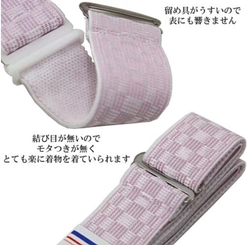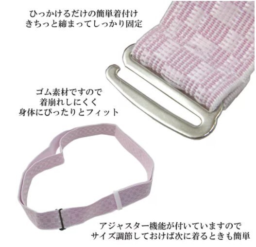 【素 材】レーヨン80% ポリエステル20% 【サイズ】巾約:約3.0cm 長さ:約約160.0cm ベルト調節アジャスター金具付き きものを着るとき着崩れしないように形を整えたり、 おはしよりを作るのが腰紐の役割。 ゴムベルトタイプの腰紐は、腰に巻いた後、 留め具で留めるだけなので、紐を結んでる間に 下前が落ちてくる心配もなく、初心者の方でも 扱いやすいのが特徴です。 留め具がうすいので、表にも響きません。 また、胸元を整える胸紐としても使われます。 結び目が無いのでモタつきが無く、 とても楽に着物を着ていられます。 (あまりきつく締めないのが楽に着る秘訣です。) ゴム素材ですので着崩れしにくく、 身体にぴったりとフィット。きちっと締まり、 ウエストに腰紐がくい込む心配がありません。 お着物を着る際の最大のポイント おはしょり も苦しくならずに快適に作ることが出来ます。 引っ掛けるだけの簡単着付けで、着物を着た後で 裾を直すのも自由自在に出来ます。 着物でのお食事の際にも苦しくなく、 美味しいものを沢山食べれますよ。 アジャスター機能が付いていますので、 ご自分のサイズに調節しておけば次に着るときも簡単です。 気付教室に通う方や、着付け初心者の方にも おすすめの和装小物です。 ウエストベルトの長さを、自分のウエストの 約1.5倍の長さになるように調節して 使うとちょうど良い感じです。 ベルトの中心を体の中心に当てて後へ回し、 交差して締めながら前へ引き、金具を留め重なるように整えます。 |