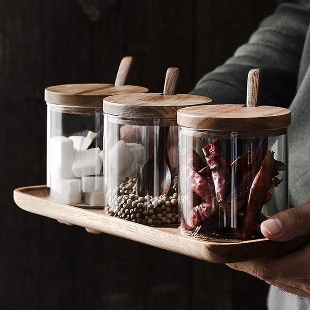 調味料入れ 3個組 塩・コショウ・砂糖入れ 木蓋・木台・小匙付き オシャレ クリエイティブ ガラス調味料ケース ナチュラル 北欧風