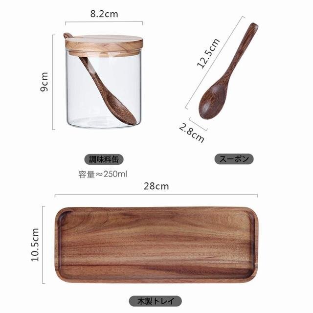 内容:ガラス缶(蓋付)×3、木製トレイ×1、小匙×3