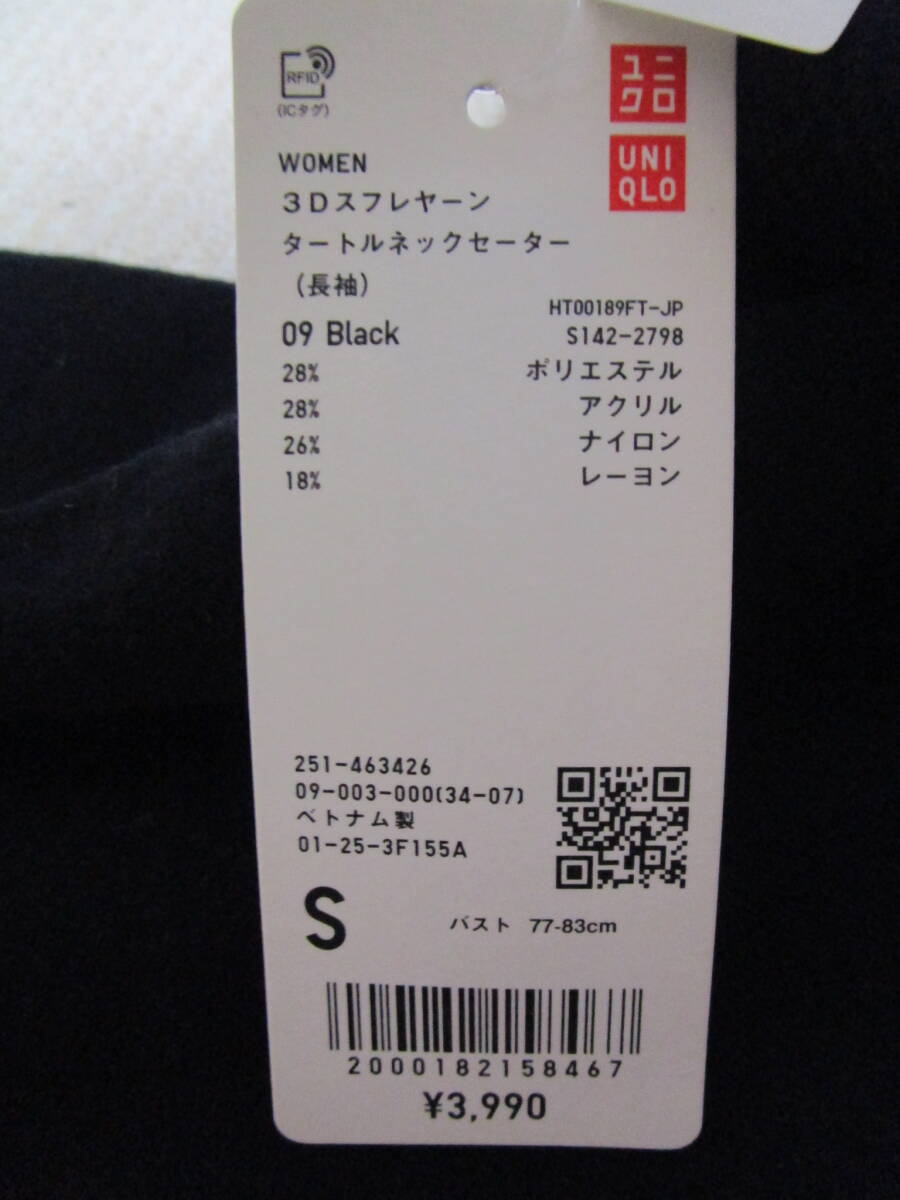 UNIQLO ユニクロ WOMEN レディス 3Dスフレヤーン 長袖 ニット タートルネックセーター Black 黒 無地 size S  のご紹介です。