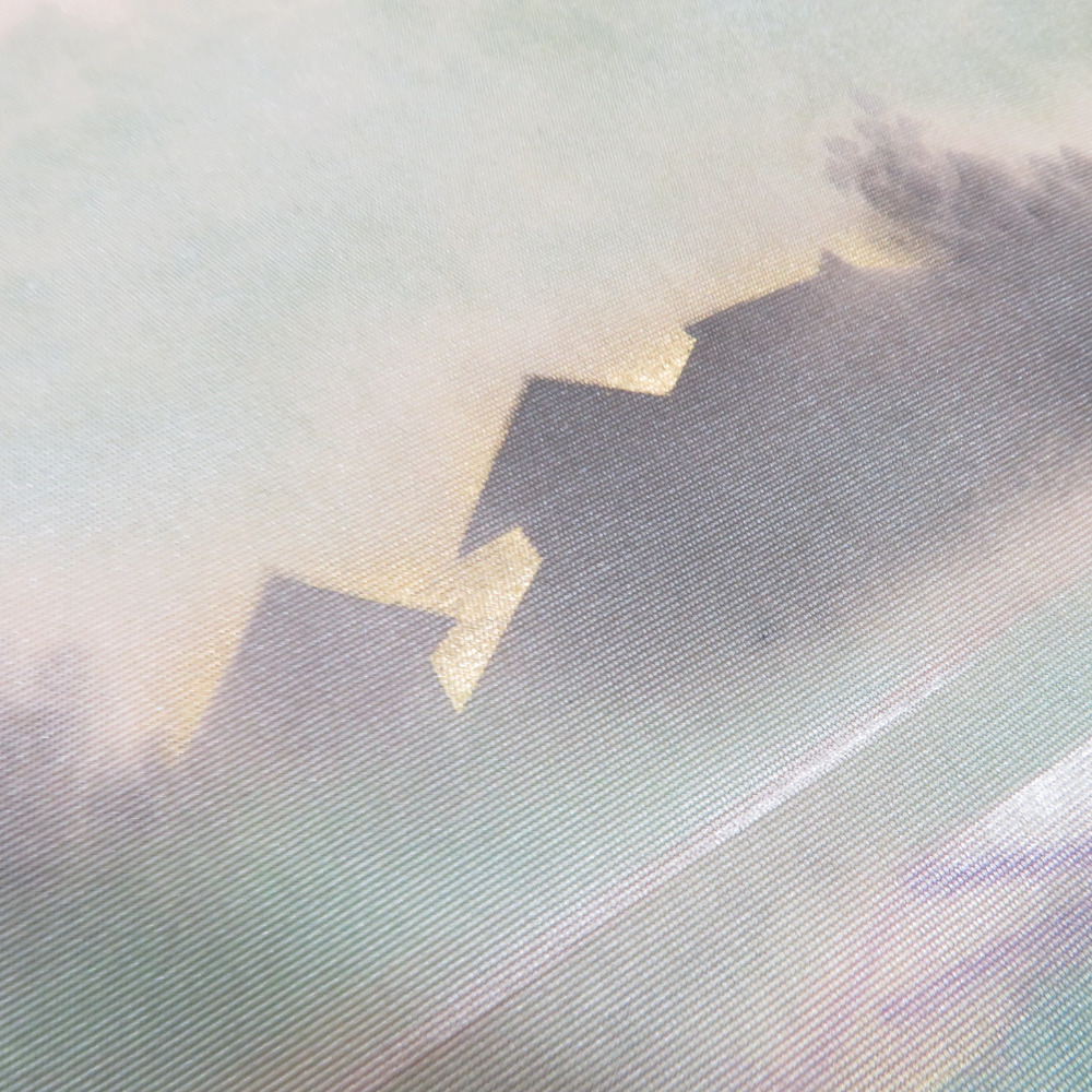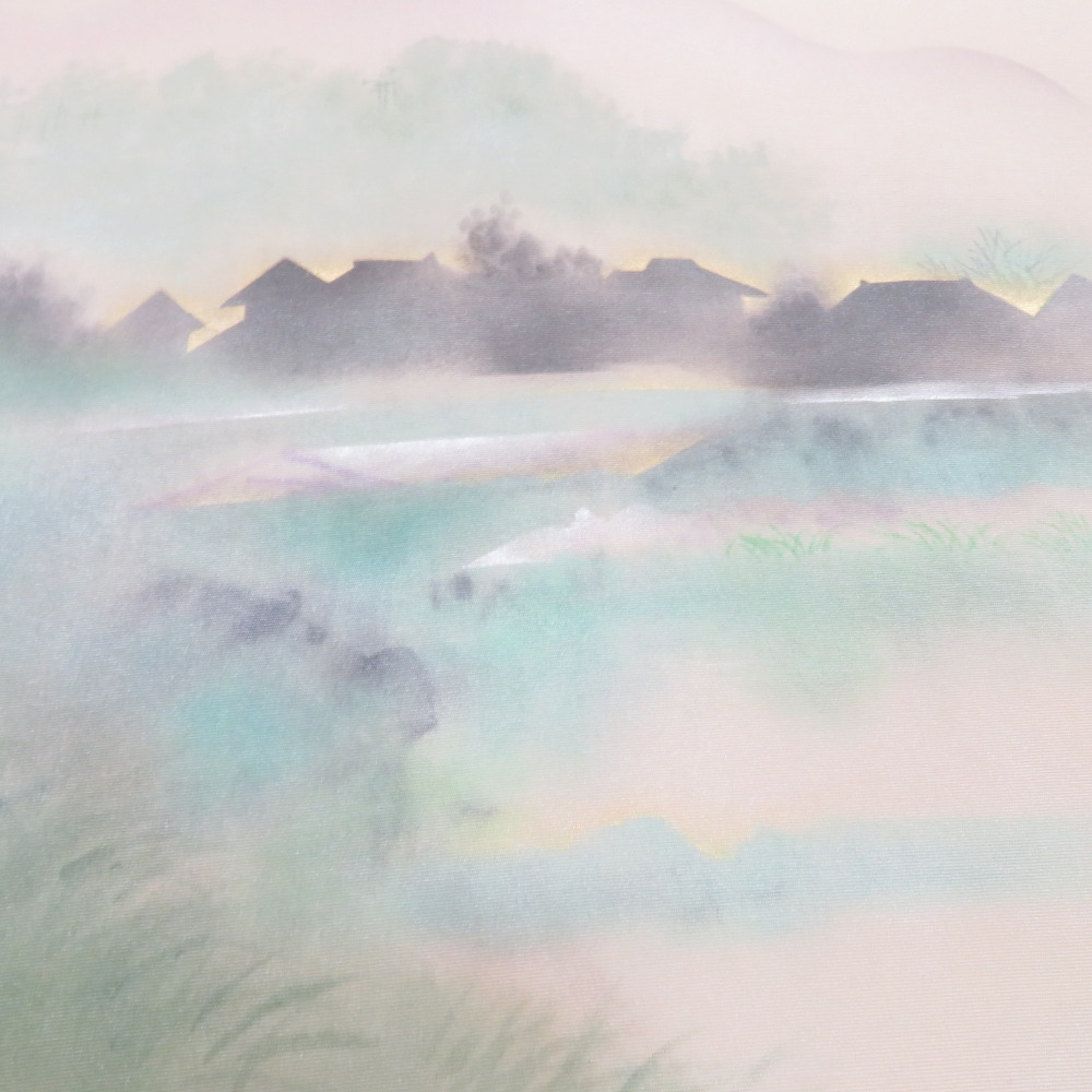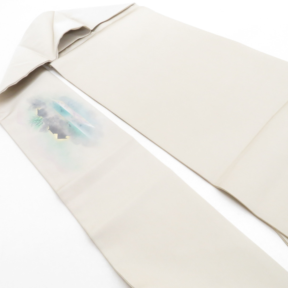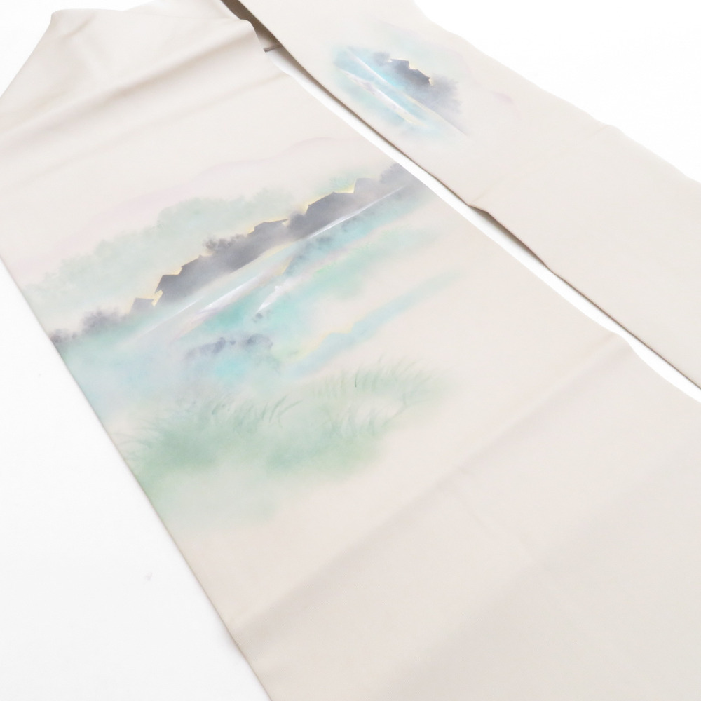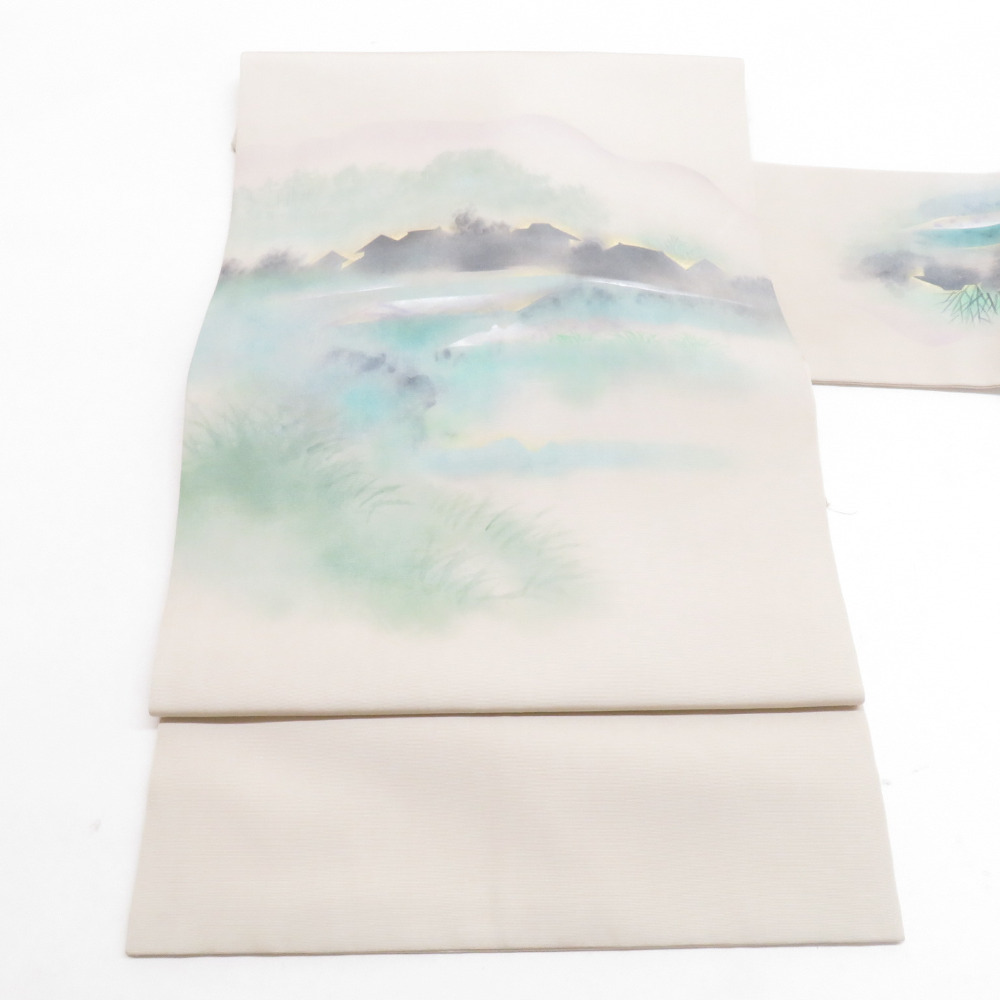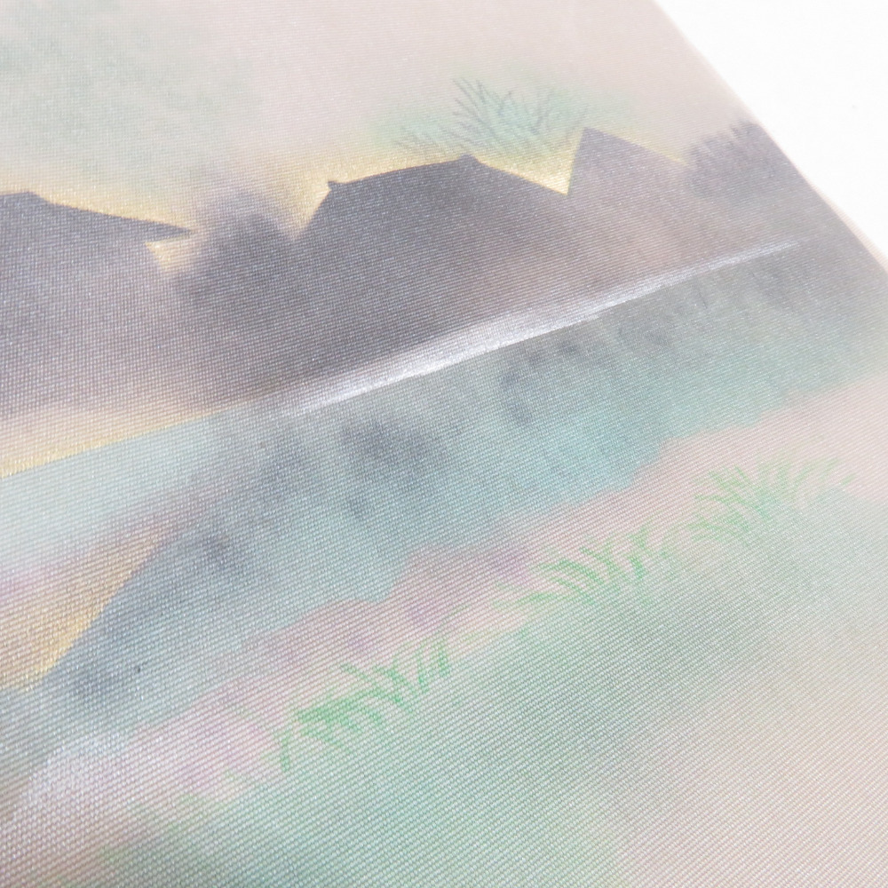 | 名古屋帯 正絹 塩瀬 灰茶地 田舎風景柄 お太鼓柄 九寸帯 カジュアル 仕立て上がり 着物帯 長さ370cm |