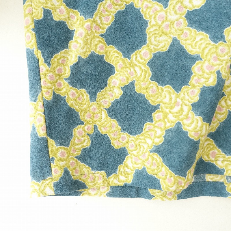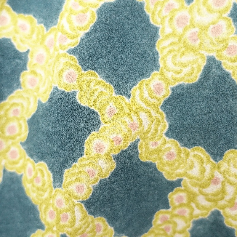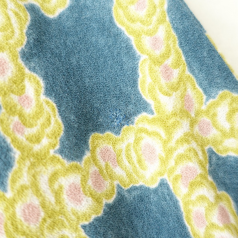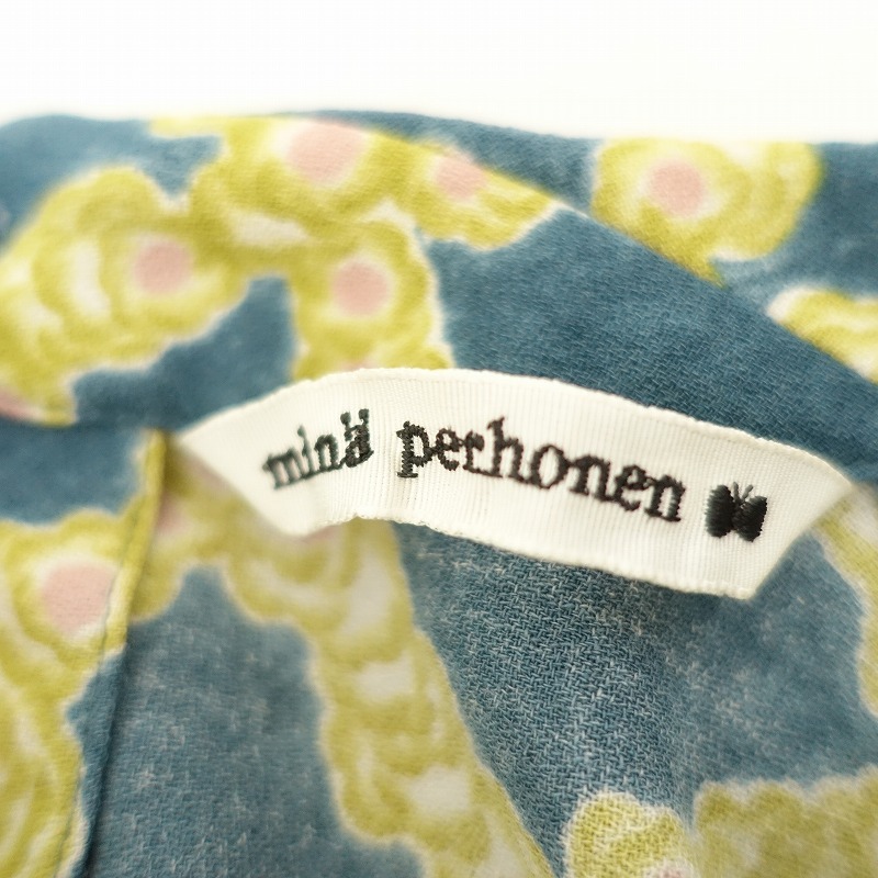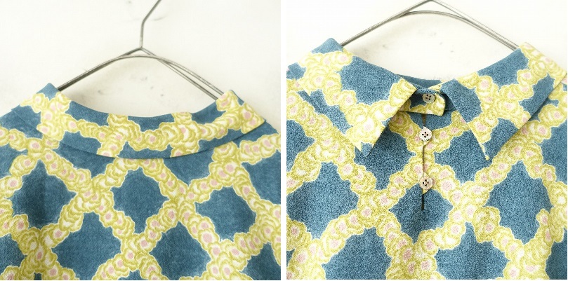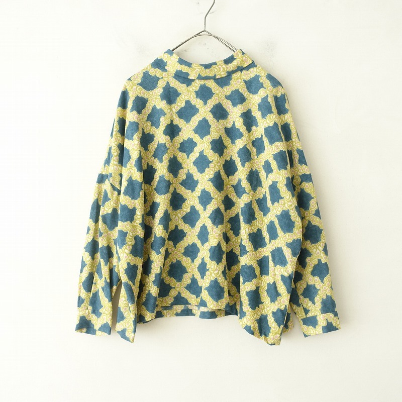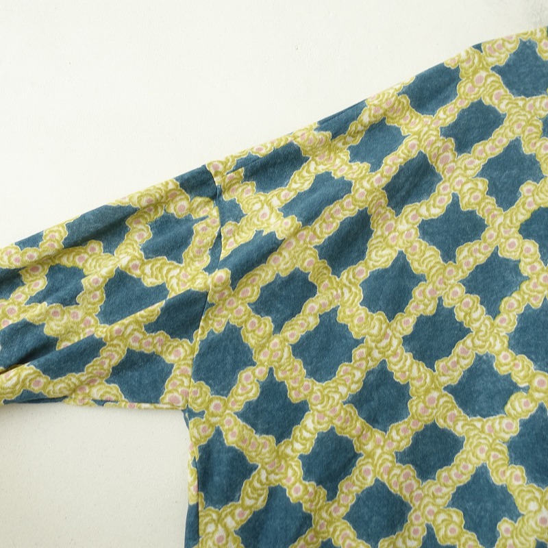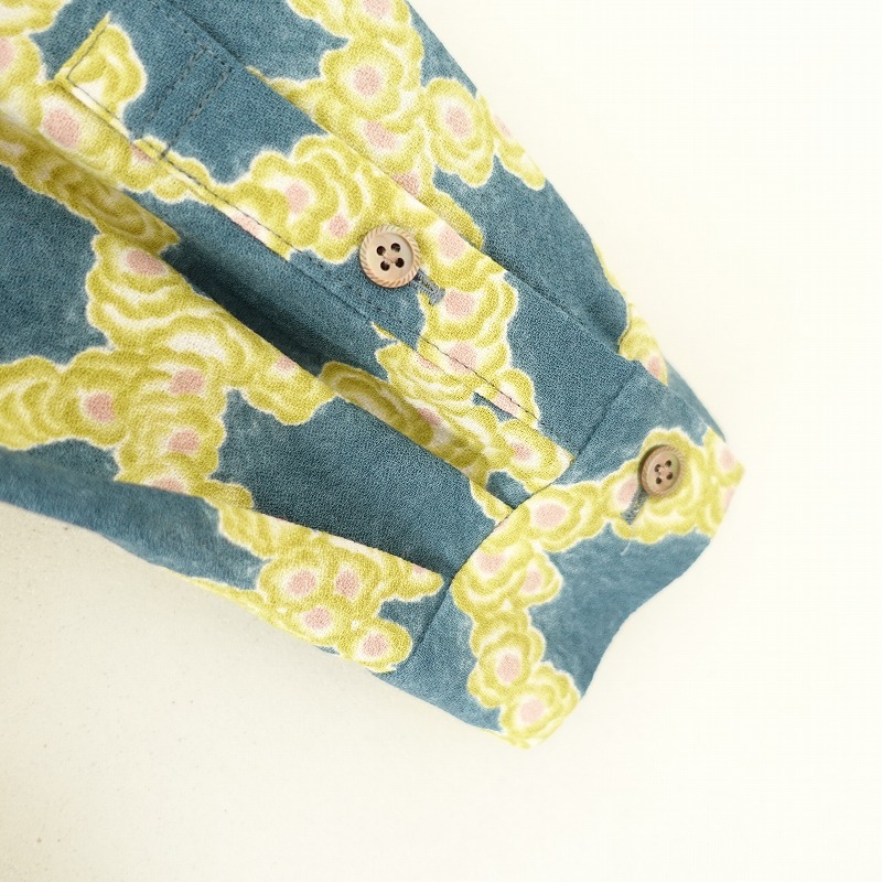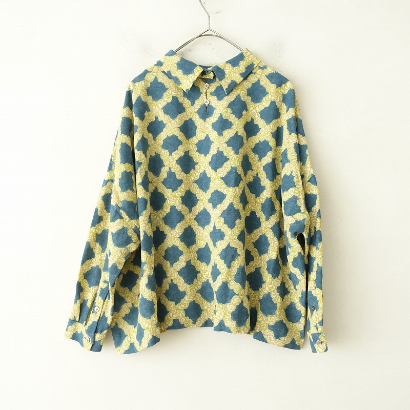 mina perhonenの「petal check」プリントワイドブラウスです。カラーは水彩タッチのくすんだ緑×黄緑・白・ピンクです。細かなシボを配した、ウールのサラリとしたちりめん風生地を使用。背部3ボタン開きのプルオーバーブラウスです。ロールカラーに肩が落ちたドロップショルダー、かなり身幅の広いサイジングです。袖口はタックを入れ、短冊・カフスの2ボタン留めです。ポケットはございません。 |