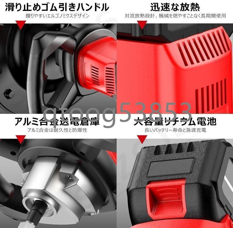 【大容量バッテリー】大容量バッテリーを搭載したワイヤレスリチウムバッテリーは、バッテリー寿命が長く、車と同型のリチウム電池、バッテリー寿命は従来のそれより30%長くなります。施工がしやすく、長く使えます。効率的な熱放散、回転熱放散技術、多孔質熱放散により、モーターを焼損から保護します。低温環境下でも使用可能です。1回の充電時間は約70~100分、大型バッテリーで約4~5時間使用でき、バッテリー寿命は市場通常のバッテリーの数倍です。そしてバッテリー寿命はより長く、より効率的です。
