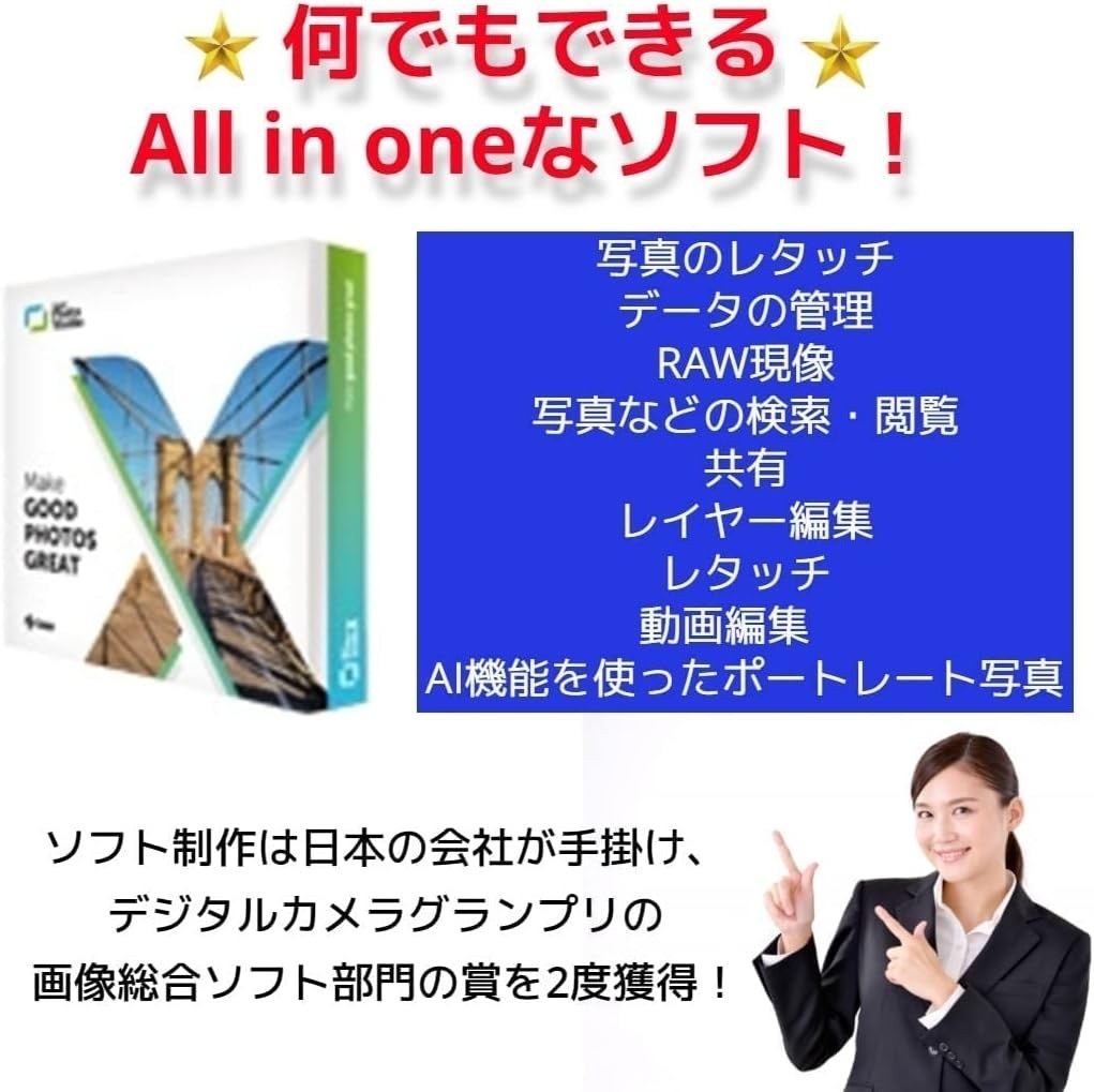画像編集、管理、現像、表示、共有、検索の全てに対応したソフトウェアです。