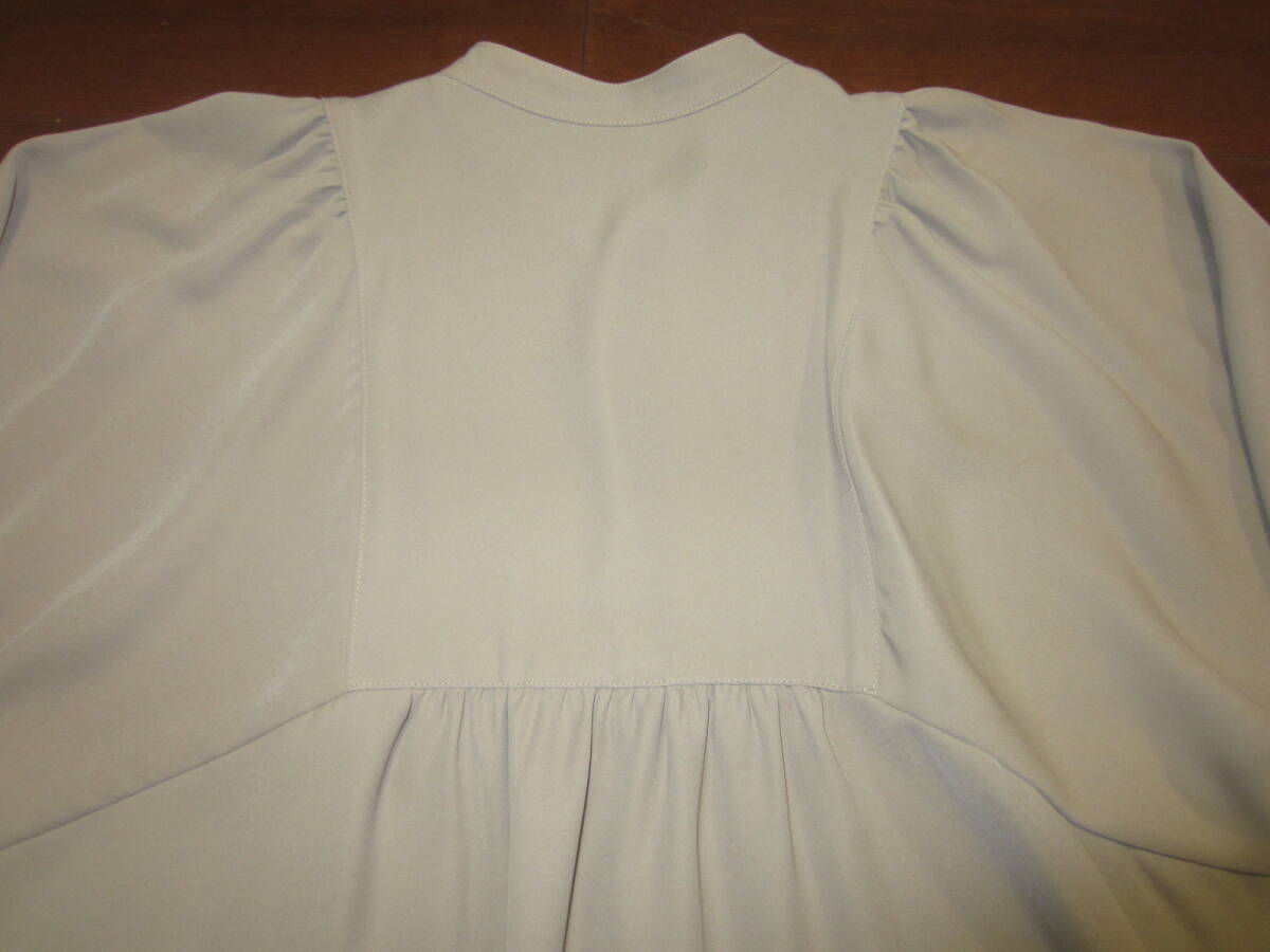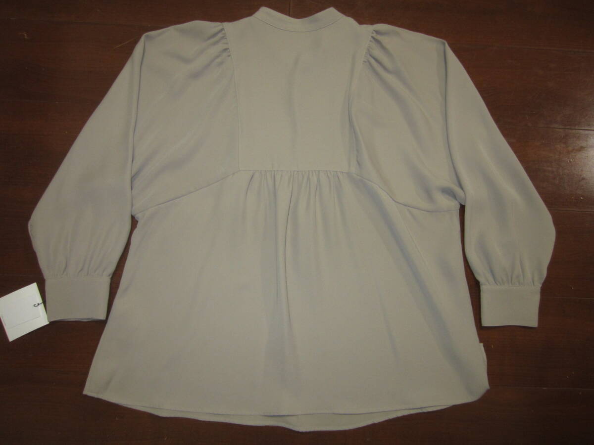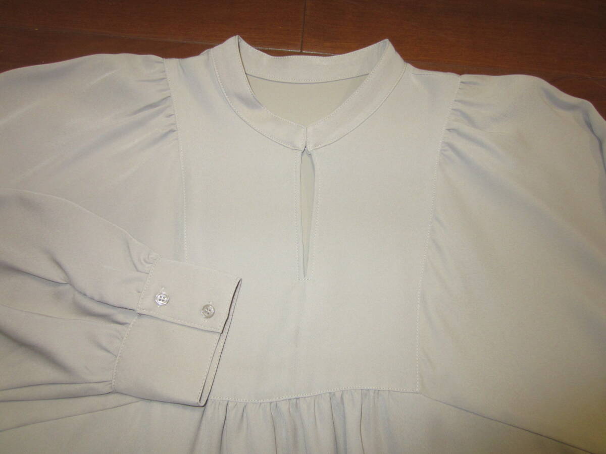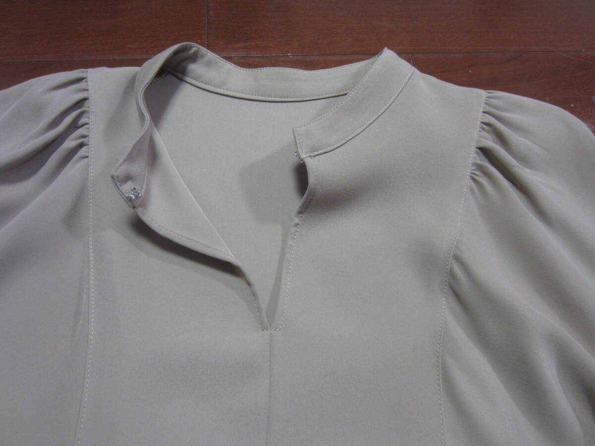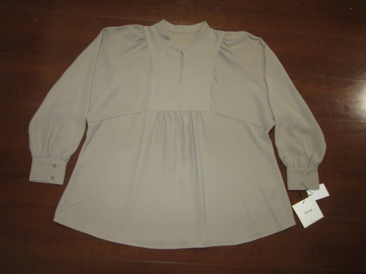 定価9900円の未使用タグ付きのElura エルーラ のスタンド切り替えブラウスです。サイズはレディースF(フリー)、ポリエステル100%、色は濃い目のベージュです。胸と袖口、背中側にも切り替えでギャザーが入っています。スタンドカラーで、首元はホックで留める形です。