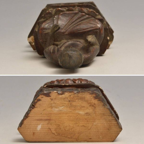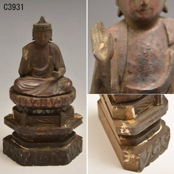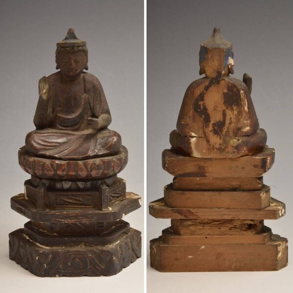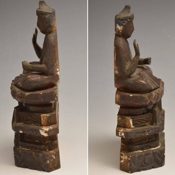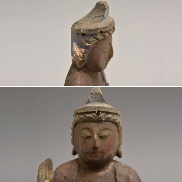 状態:手や腕まわりに小さな亀裂少しあり。全体に塗装の剥がれが見えます。(一部補色あり)背面は虫食い跡も見えます。箱無し。