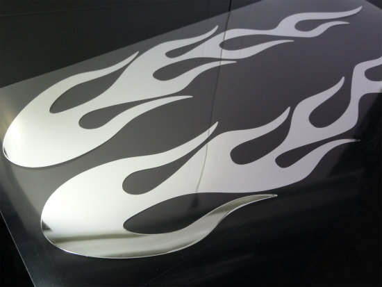 鏡面タイプのファイヤーパターンステッカーです。風雨はもちろん紫外線・海水にも強いステッカーで、屋外で5年の耐久性があります。(http://www.be-sticker.com/では他のステッカーもご覧いただけます)