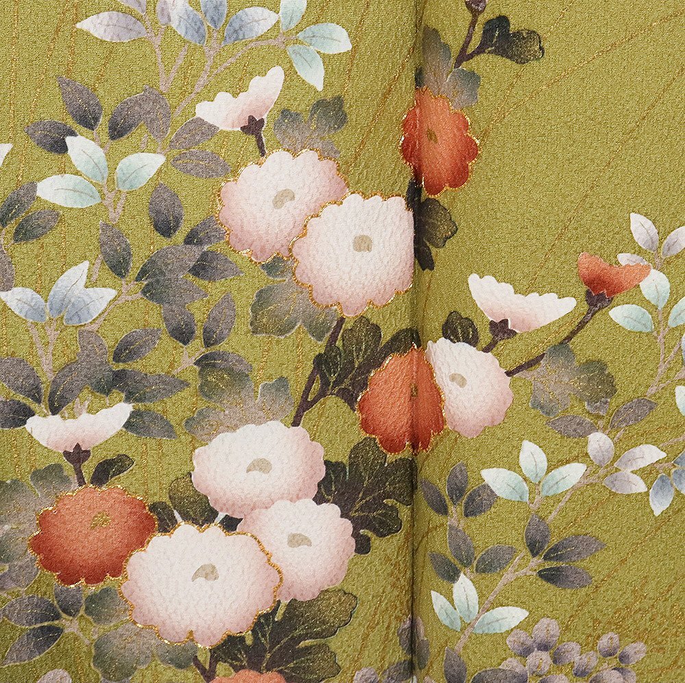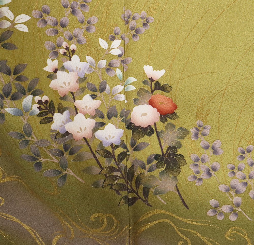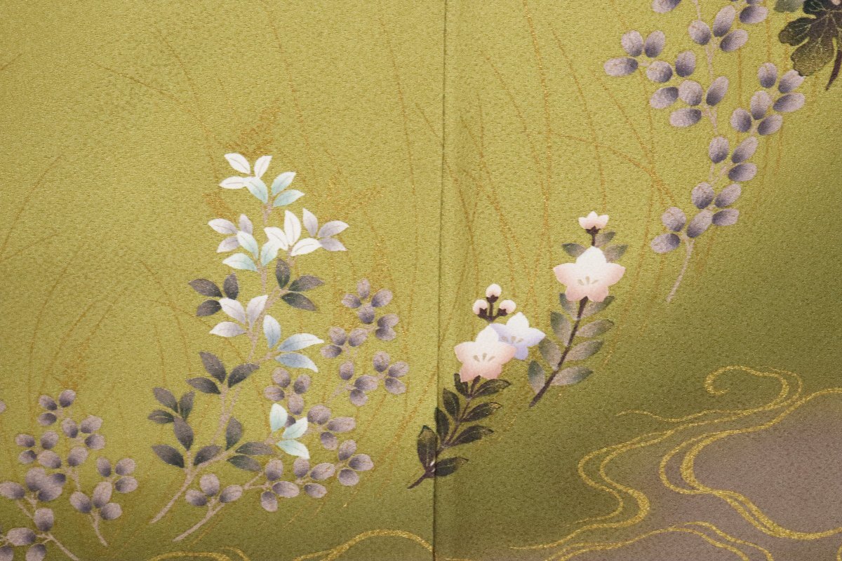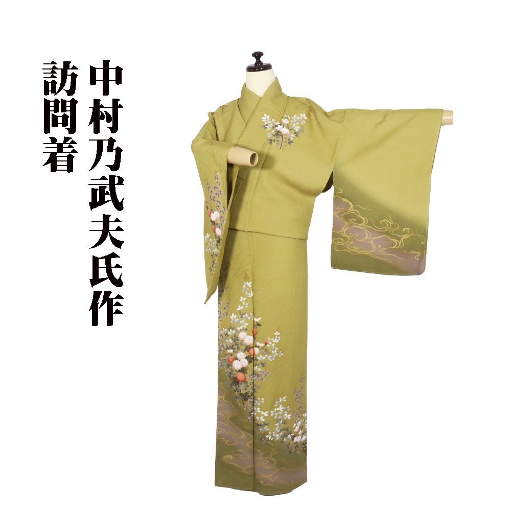 中村乃武夫氏作 訪問着 袷 丹後縮緬地 抹茶色(菜種油色)・緑色(根岸色)・紫(京紫色)・ 暈し・地 菊・桔梗 金箔・流水 (写真では上手く色が出ない場合があります。ご了承下さい) |