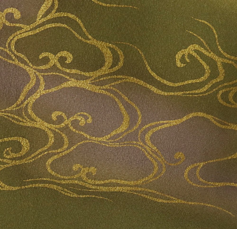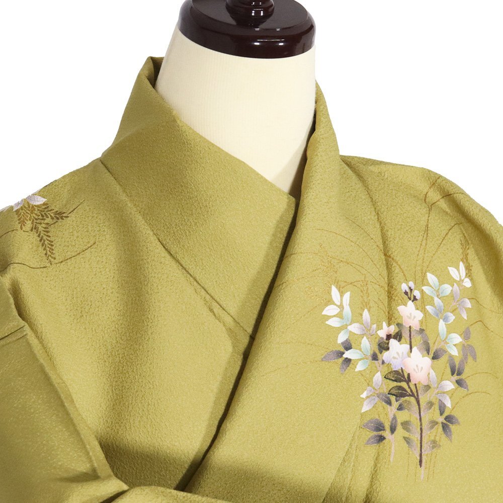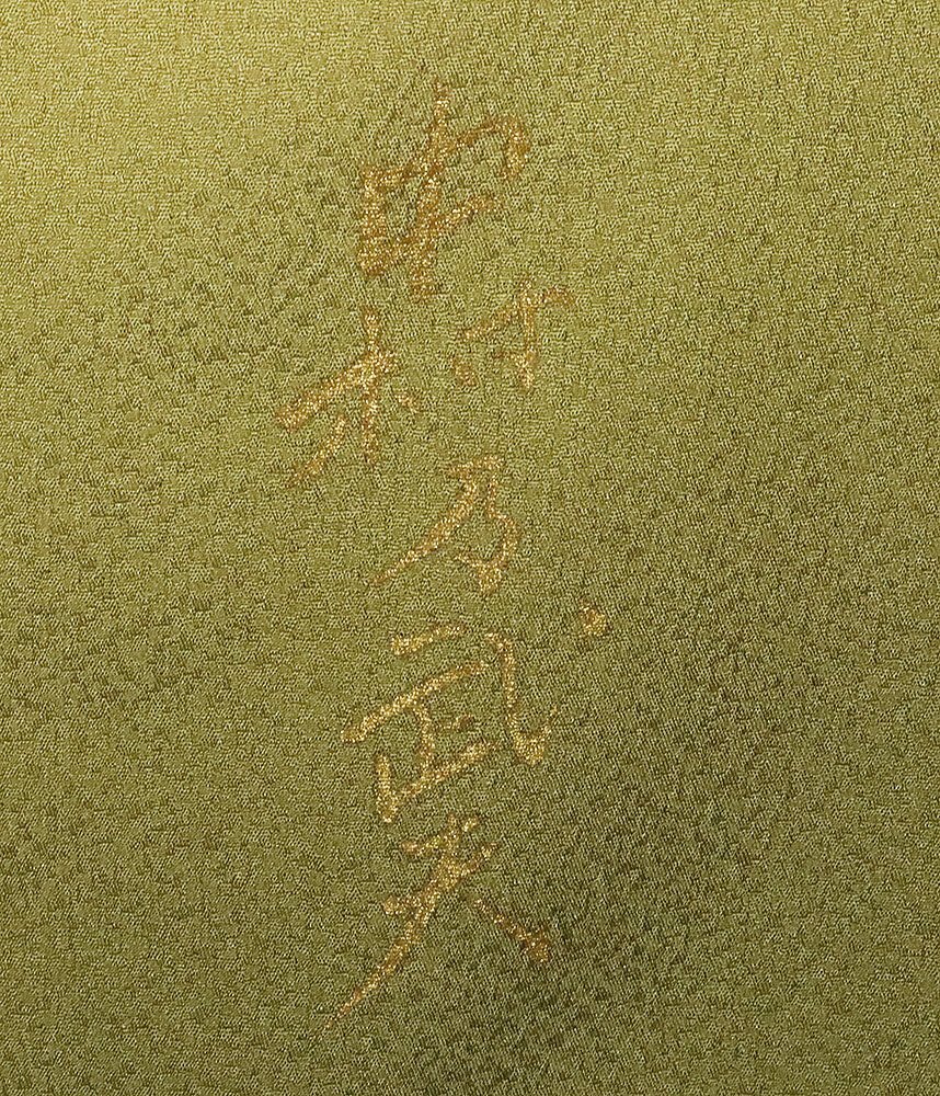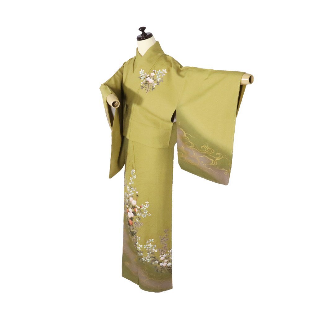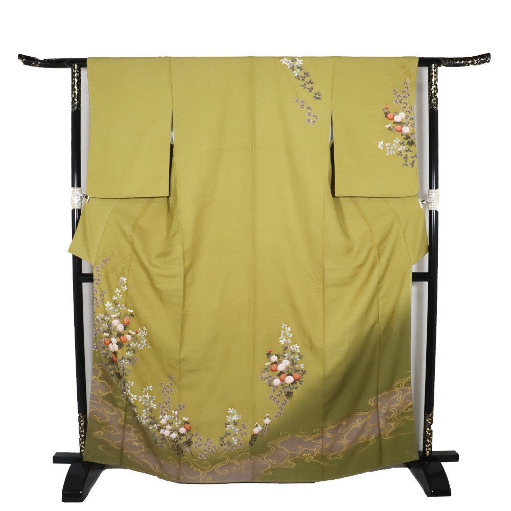 中村乃武夫氏作 訪問着 袷 丹後縮緬地 抹茶色(菜種油色)・緑色(根岸色)・紫(京紫色)・ 暈し・地 菊・桔梗 金箔・流水 (写真では上手く色が出ない場合があります。ご了承下さい) |