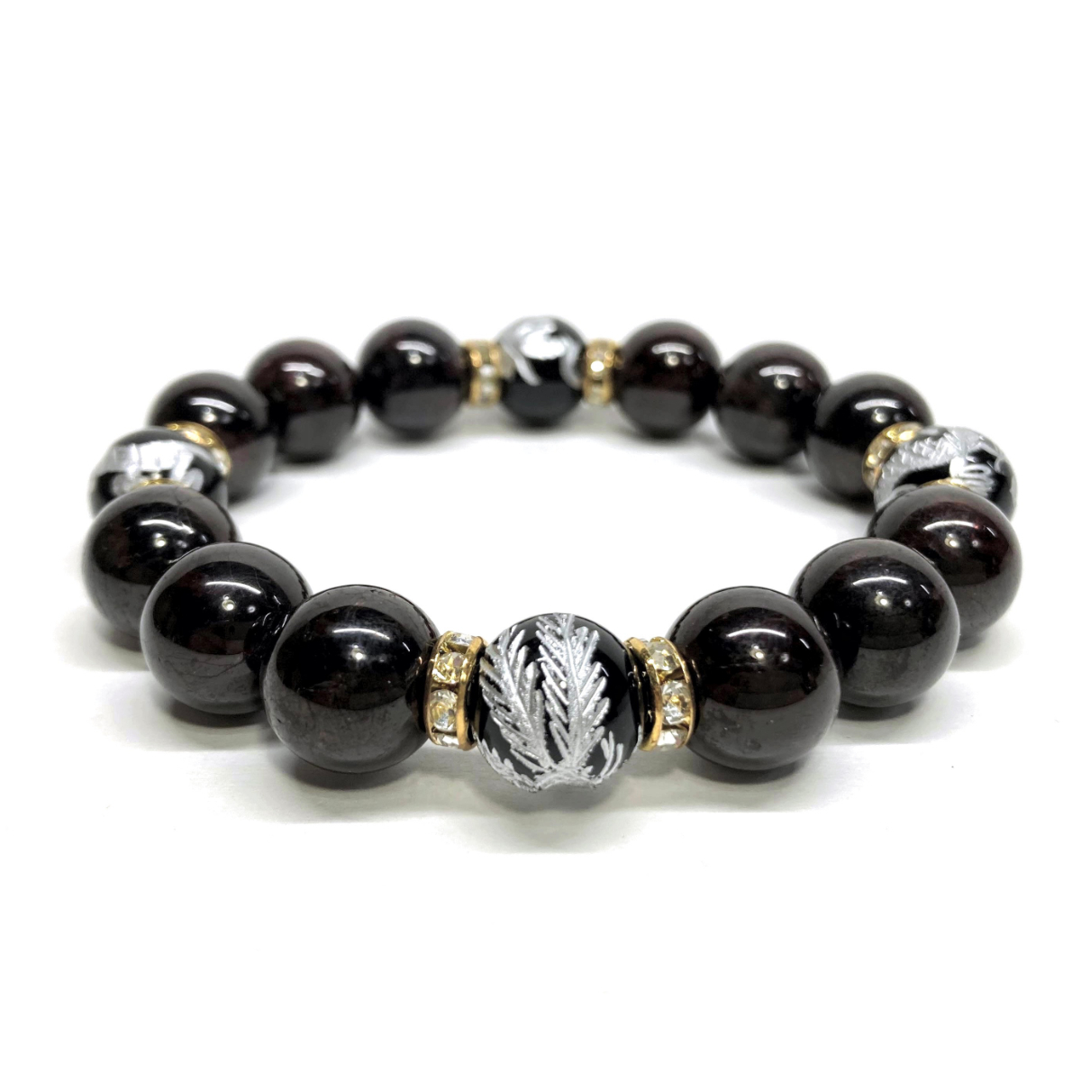 こちらは、四神獣銀彫オニキとガーネットを組み合わせたパワーストーンブレスレットです。四神獣は、中国の伝説で4つの方向(東西南北)を守護する神聖な神。四神獣、厄災から身を守り、多くの運気を呼び込むと言われております。石大きさは程よくインパクトのある12mm玉で内周 約17cmです。 数に限りがございますので気になる方はお早めにどうぞ。