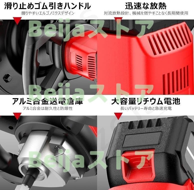 【大容量バッテリー】大容量バッテリーを搭載したワイヤレスリチウムバッテリーは、バッテリー寿命が長く、車と同型のリチウム電池、バッテリー寿命は従来のそれより30%長くなります。施工がしやすく、長く使えます。効率的な熱放散、回転熱放散技術、多孔質熱放散により、モーターを焼損から保護します。低温環境下でも使用可能です。1回の充電時間は約70~100分、大型バッテリーで約4~5時間使用でき、バッテリー寿命は市場通常のバッテリーの数倍です。そしてバッテリー寿命はより長く、より効率的です。