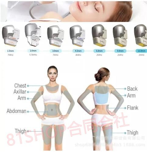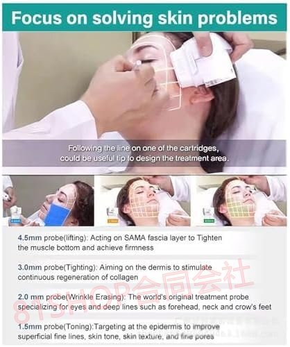 【7つのプローブ】1.5mm (7MHz)、2.0mm (5.5MHz)、3.0mm (7MHz)、4.5mm (4MHZ)、6.0mm (2MHz)、9.0mm (2MHz)、13.0mm (2MHz)を通して、それぞれ放射人間の細胞を受け取り、損傷した細胞を活性化して修復し、輪郭を強化し、栄養素の吸収を促進します。