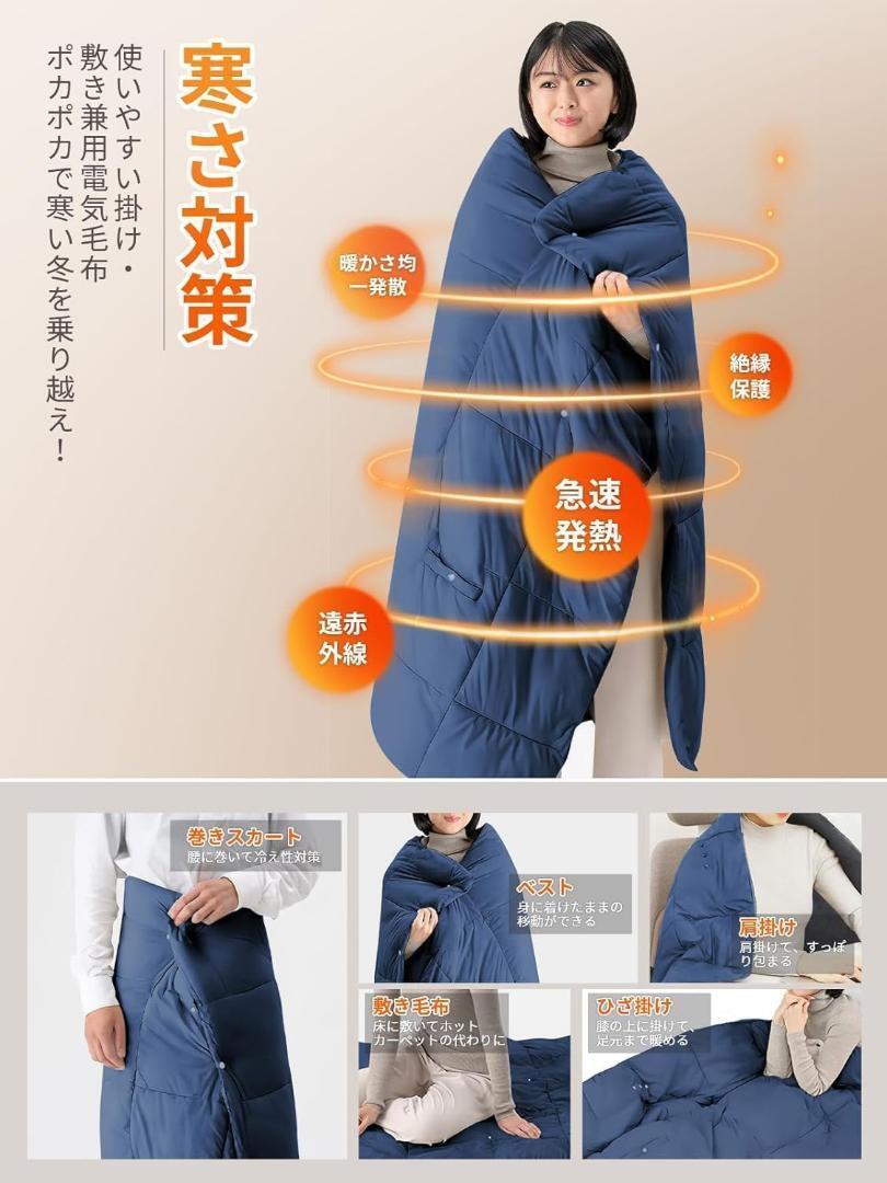 日本製グラフェン繊維を採用して、寒い冬でも、瞬時にお腹から背中周りを温めてくれる電熱毛布です。5つのスタイルにチェンジできる、ひざ掛け、ベスト、肩掛け、巻きスカート、敷き毛布など用途に合わせて使い方は自由自在です。