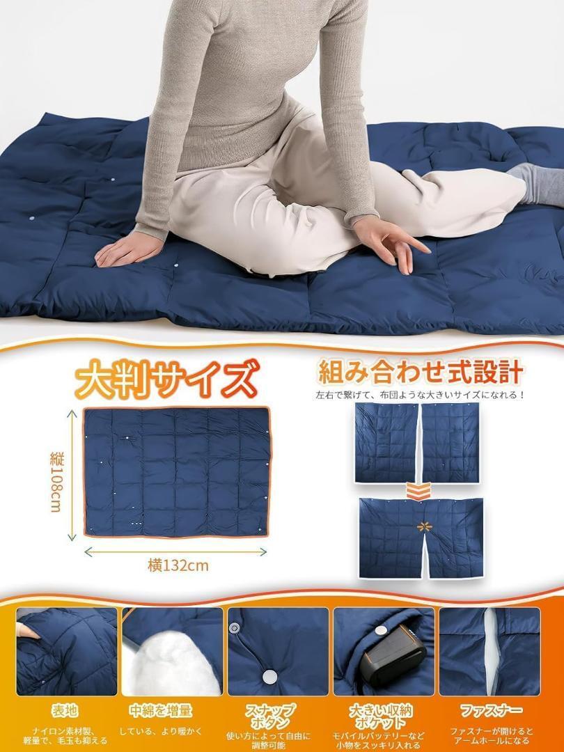 横132*縦108cmの大きいサイズ、男女兼用可能。組み合わせ式設計、2枚の電気毛布の左右でのスナップボタンを繋げて、布団ような大きいサイズになれます。手で丸洗い可能、洗濯機も対応し、お手入れ簡単、いつでも清潔にお使いいただけます。