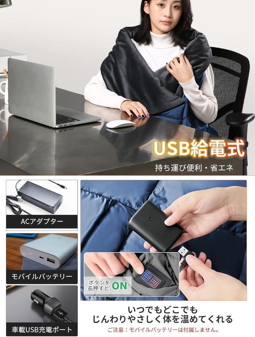 コードレスのUSB給電式なので、電気ブランケットをモバイルバッテリーなどのUSB電源に接続してスイッチONにするだけで、操作が簡単です。身に着けたままの移動もできます。
