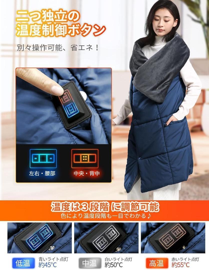 6枚ヒーターが内蔵、より広く発熱範囲、ボタンを押すだけで全身すぐにポカポカ。二つ独立の温度制御ボタンが搭載、高温(約55℃)、中温(約50℃)、低温(約45℃)との3段階調温可能、腹から背中周りの温度を別々設定できて嬉しいです。