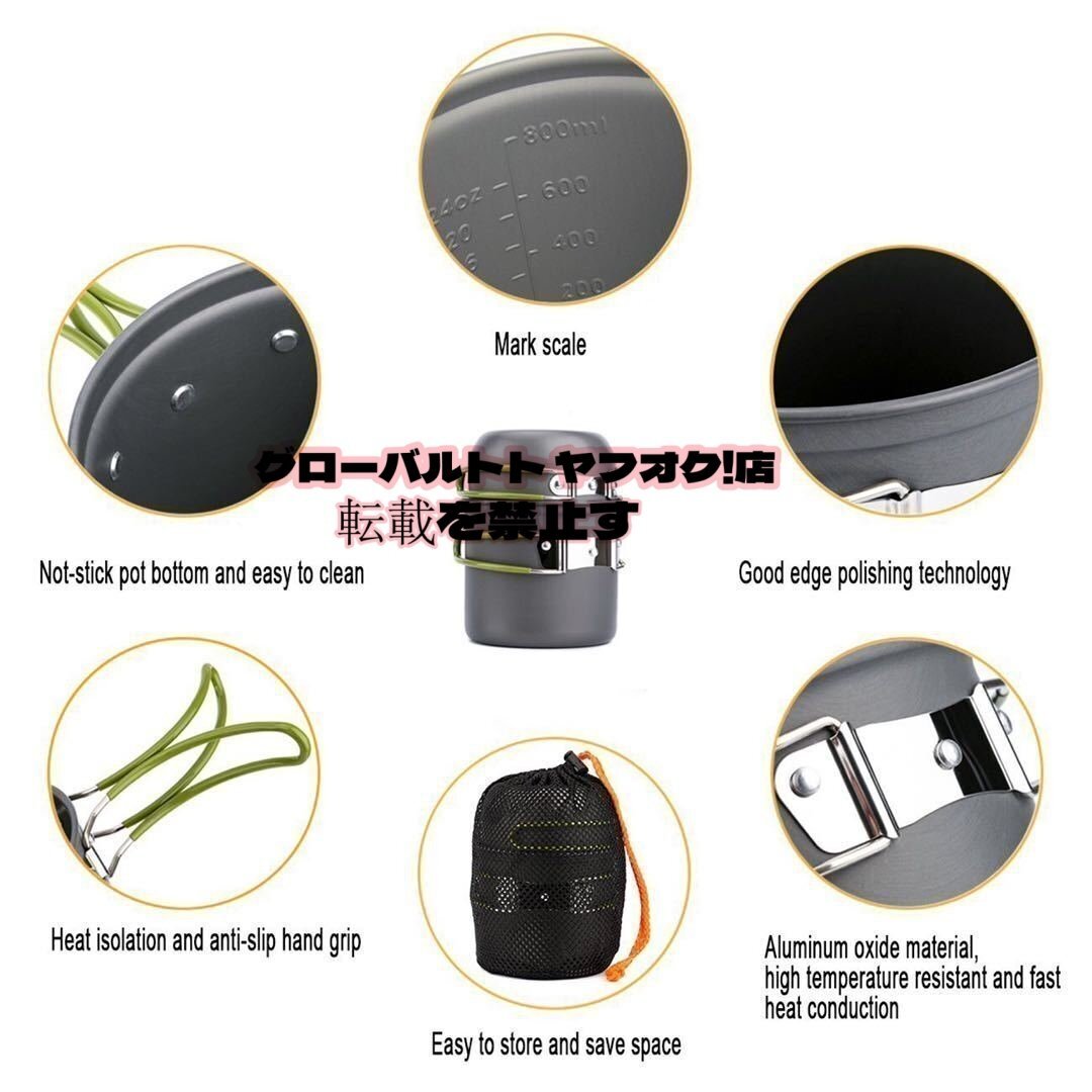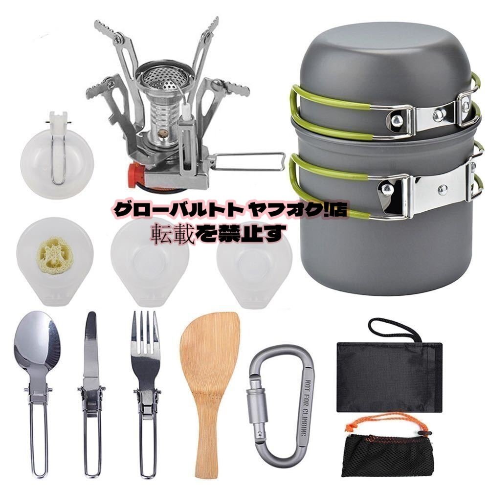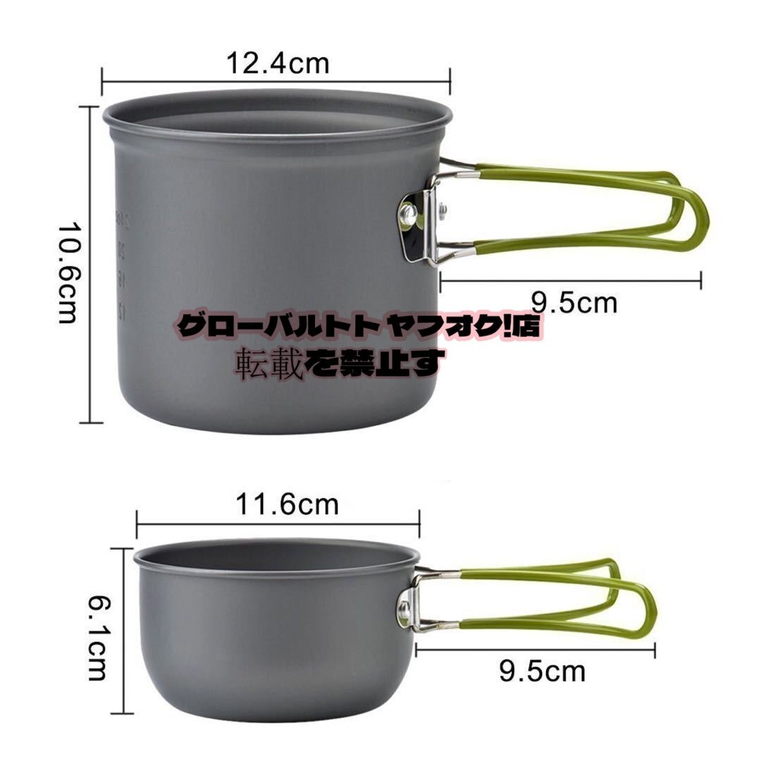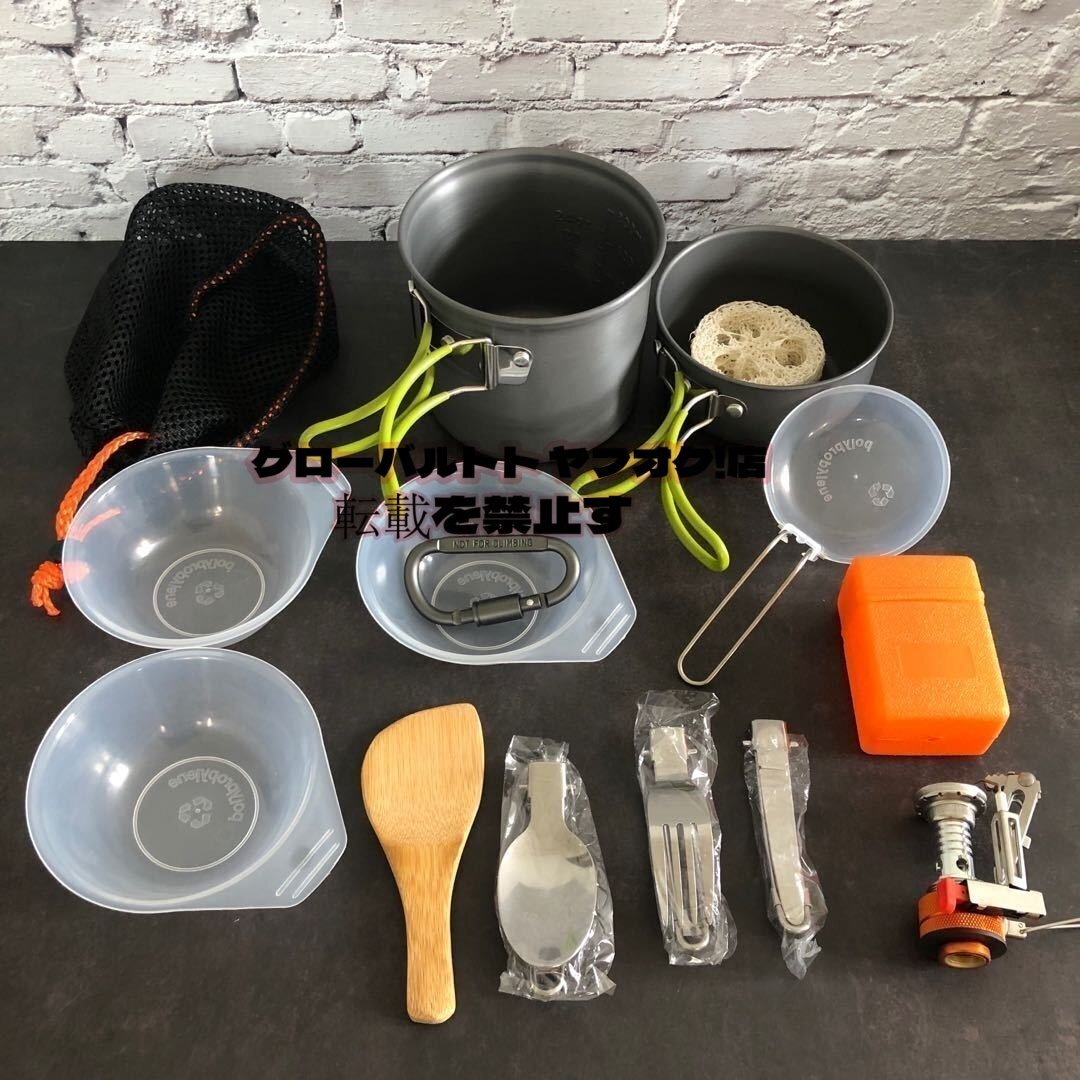 【セット内容】 アルミニウム鍋*2,木製シャベル*1,食品レベルPPお碗*3,バーナー*1,スポンジ*1,スプーン*1,テーブルナイフ*1,フォーク*1,Dリング*1,小さな布バッグ*1,メッシュバッグ*1