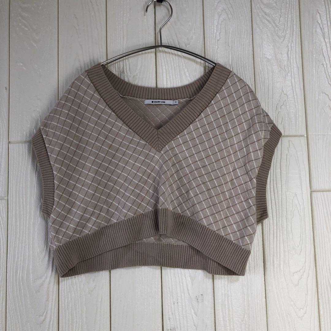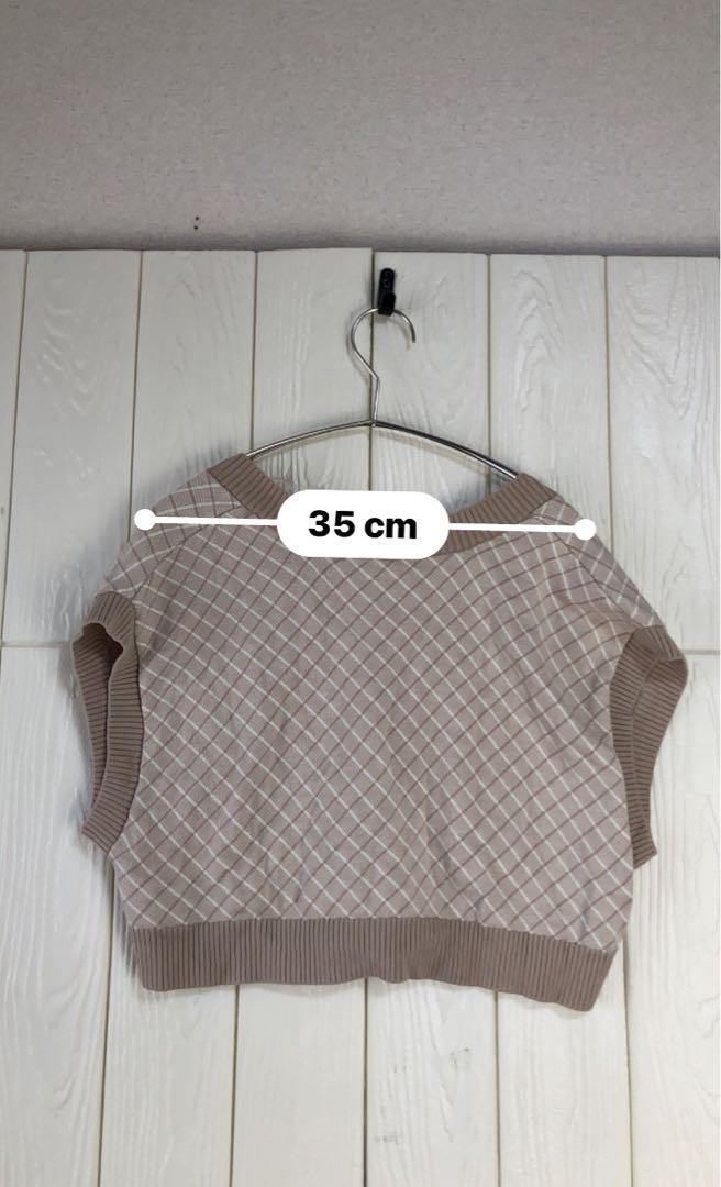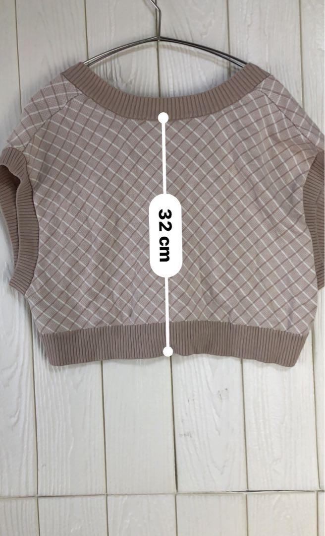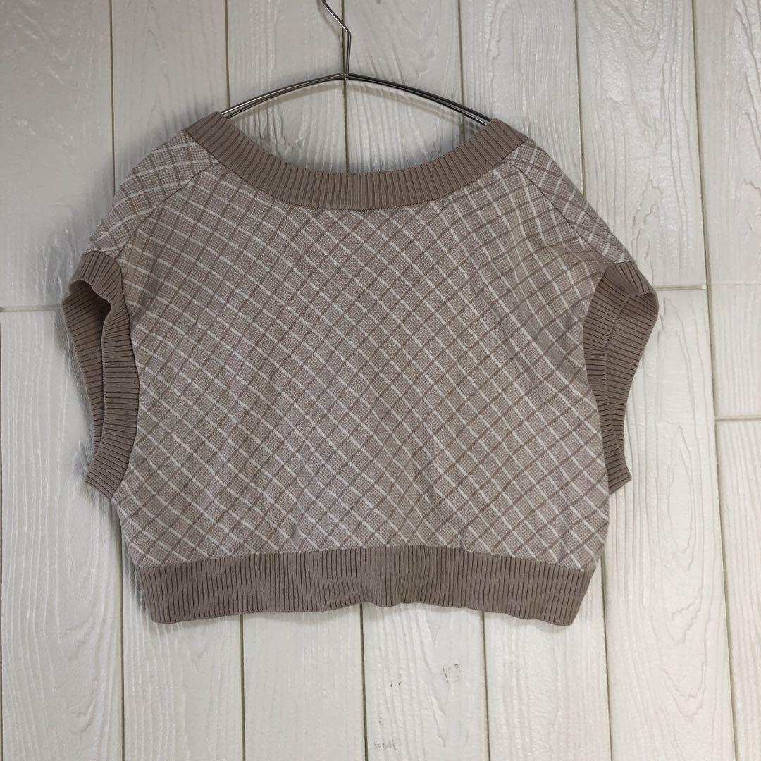 ダイヤモンド柄のベージュニットベスト、ノースリーブデザインで春夏に最適。