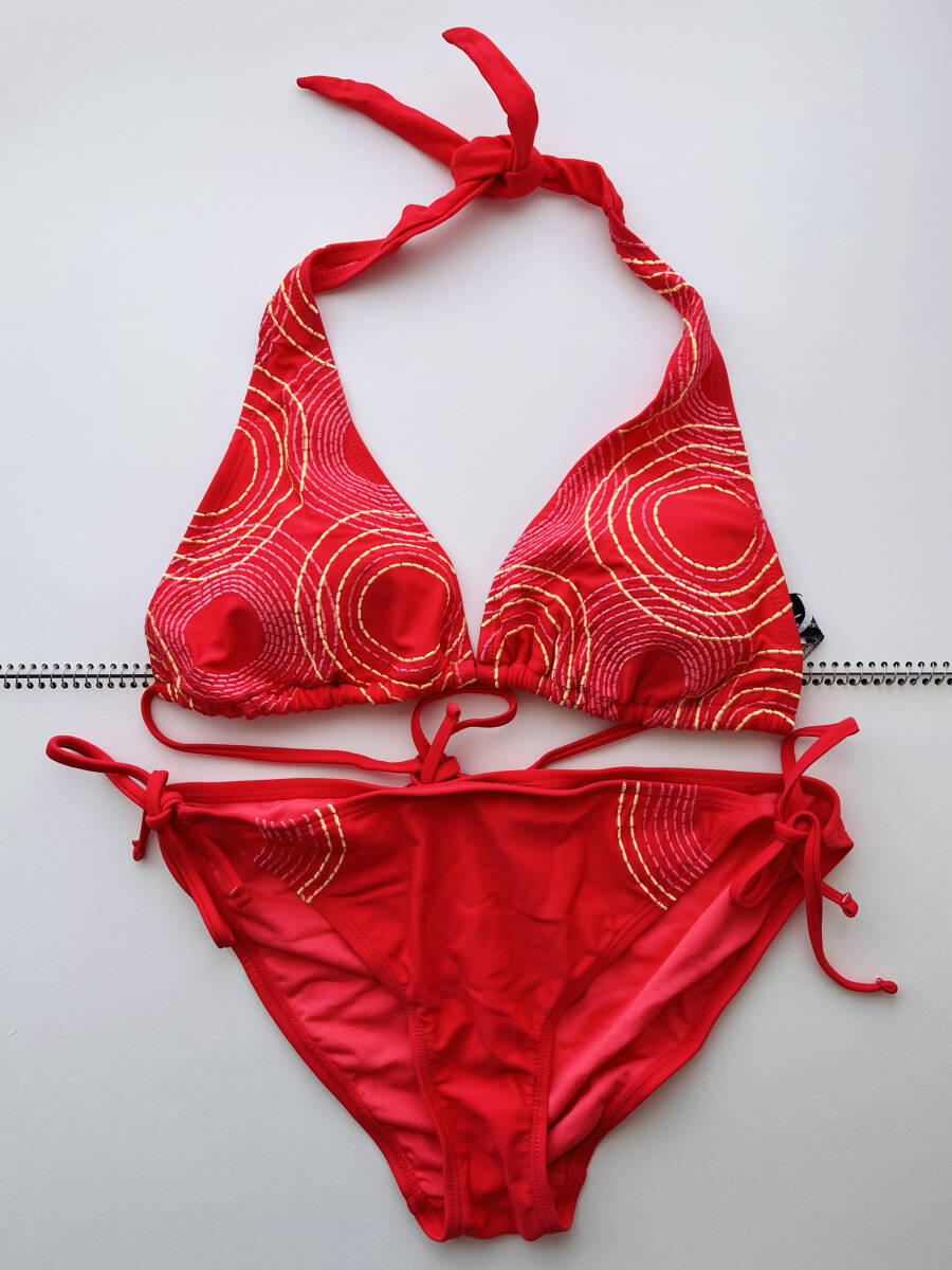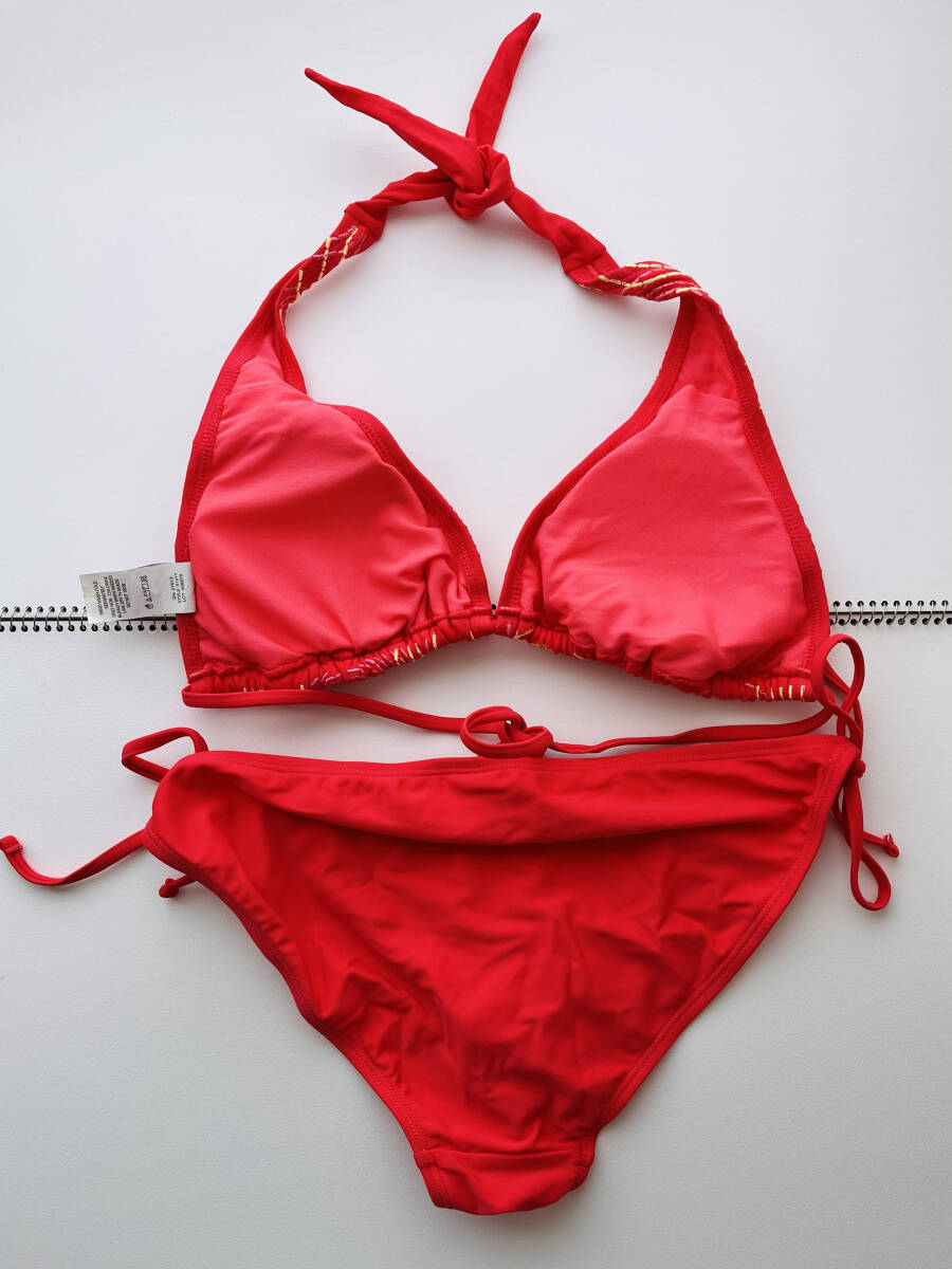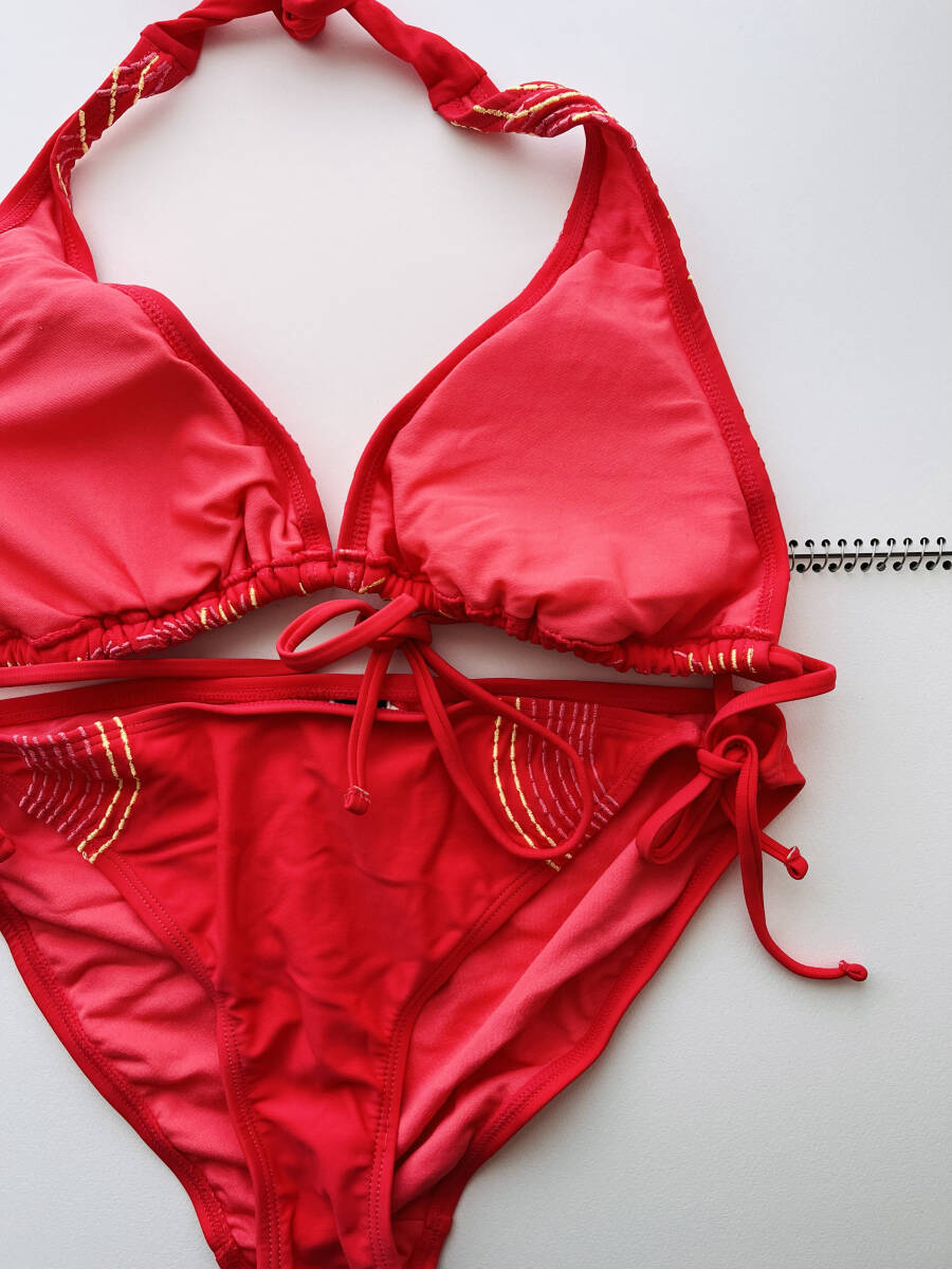 未使用 Lサイズレディース 水着 ビキニ 水泳 スイムウエア 上下セット 水玉 赤レッド 刺繍 ブラトップ ショーツ ボトム プール ビーチ 海