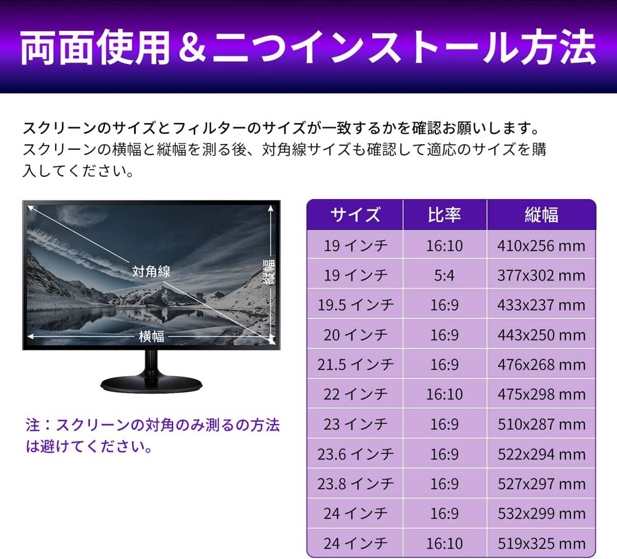 【対応サイズ】22インチ 16:10 475 x 298mmに対応します。モニターの画面正面を中心に60°(左右30°)より外の角度からは画面がまっ黒に見えるので、パソコンの画面上に個人情報が表示されたり撮影されたりするを防ぐために個人情報の盗難を防止します。