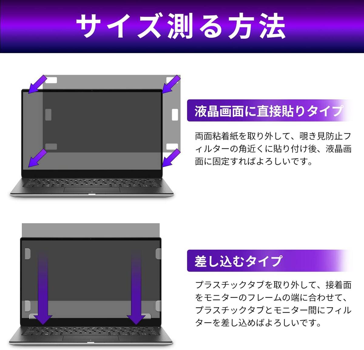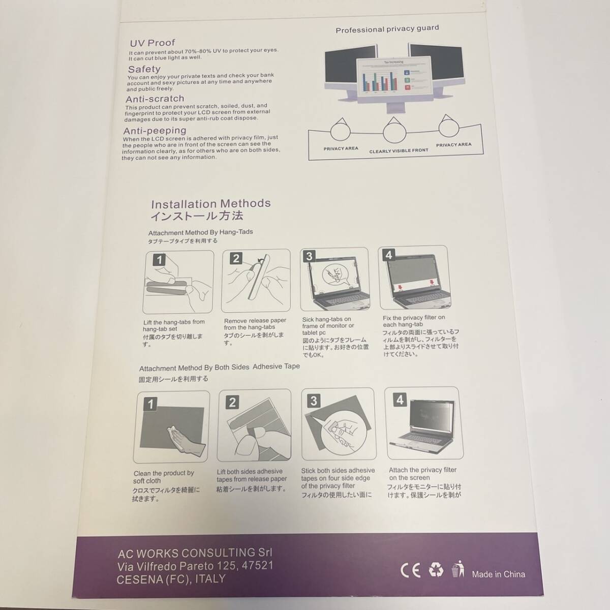 【インストール簡単】2種インストール方法があります。スライド式のタブタイプと画面に直接貼る固定タイプです。【包装内容】覗き見防止フィルター*1、インストール説明書、クロス、両面粘着紙(固定するタイプ)、プラスチックタブ(スライドタイプー)。注:タッチパネルには対応しておりませんので、ご了承ください。