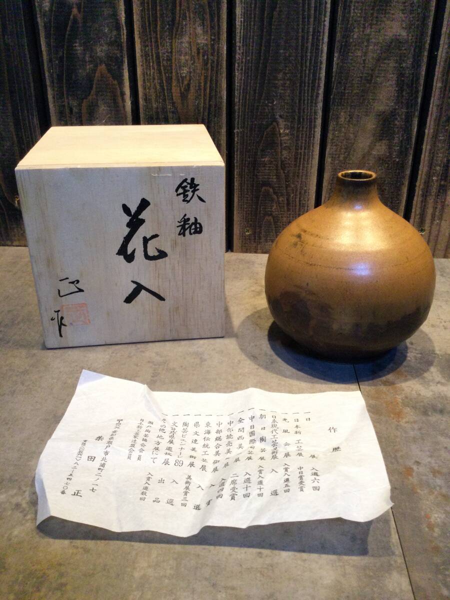 新品・未使用 瀬戸焼 鉄釉花瓶 柴田正 花入 花器 共箱・栞付き 華道 茶道具 茶道 茶の湯 フラワーベース 工芸品