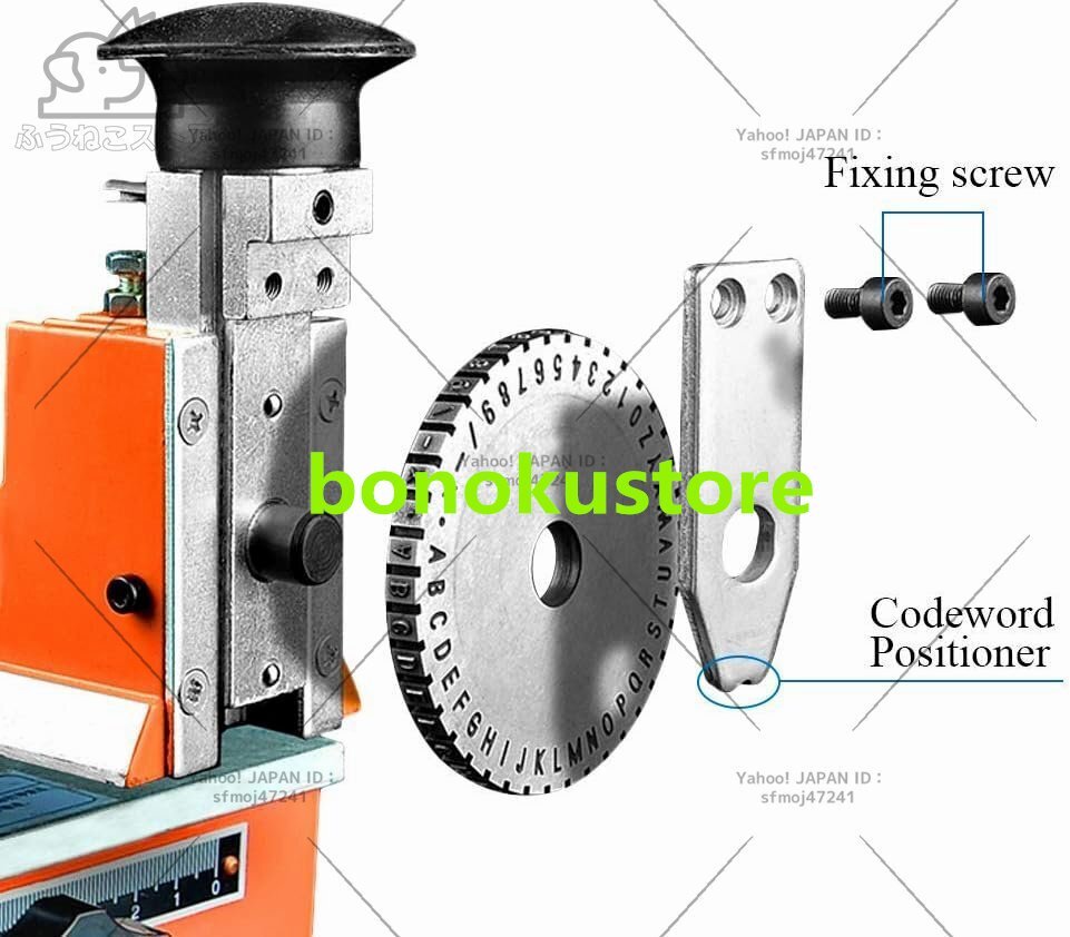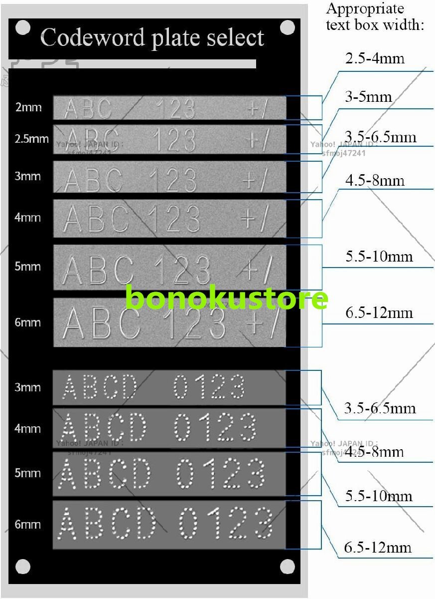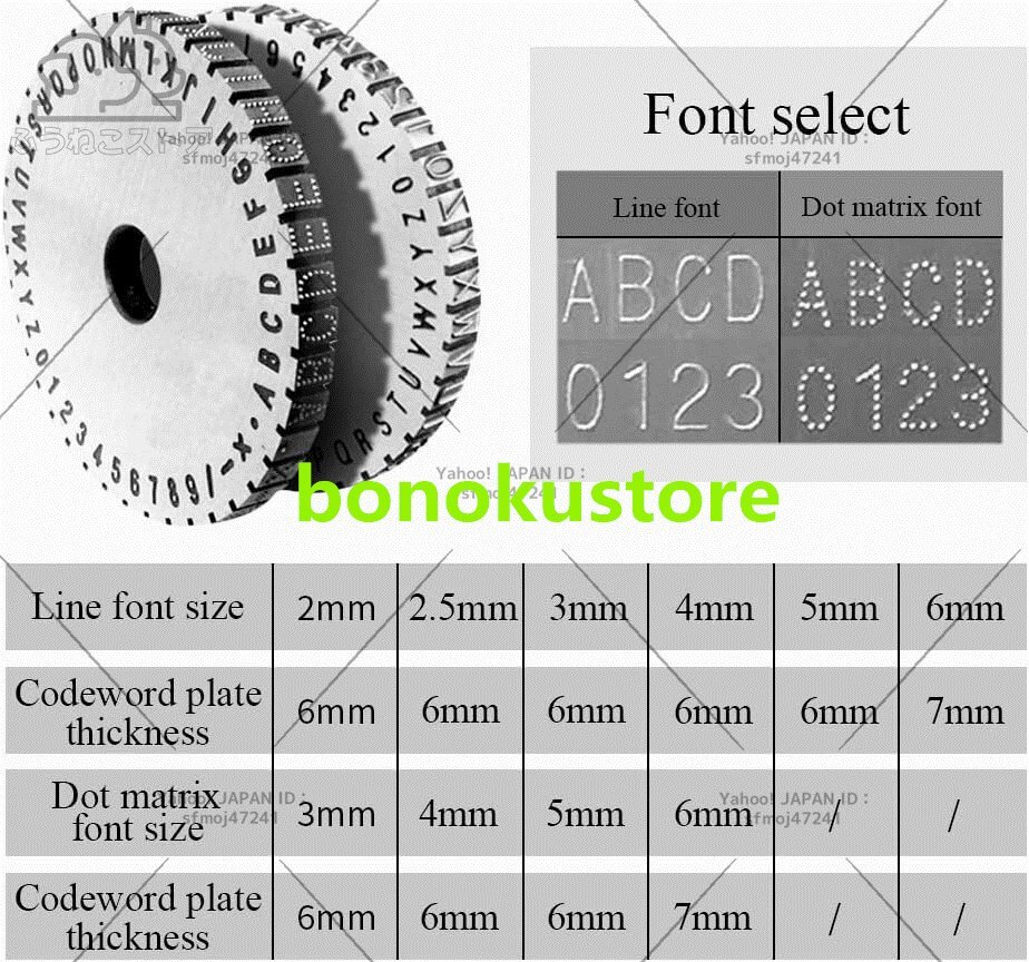 | コード: 文字数:40 英字:ABCDEFGHIJKLMNOPQRSTUVWXYZ アラビア数字:0123456789 簡単な記号:・×/一 | 1. No.2コードワードプレート:フォント高さ2mmフォント幅1mm 2. No.2.5コードワードプレート:フォント高さ2.5mmフォント幅1.25mm 3. No.3コードワードプレート:フォント高さ3mmフォント幅1.5mm 4. No.4コードワードプレート:フォント高さ4mmフォント幅2mm 5. No.5コードワードプレート:フォントの高さ5mmフォントの幅2.5mm 6. No.6コードワードプレート:フォント高さ6mmフォント幅2.8mm | 1.材料:クロム鋼12CrMo 2.硬度:> 60度 3.厚さ:6 mm(6ポイントフォント7 mm) 4.直径:80.5 mm 5.シャフト穴:14.1 mm 6.ワードプレートの全円の位置決め誤差±0.10 mm(オーバーラップまたはカーニングを避けるために、印刷文字は制御できません) |