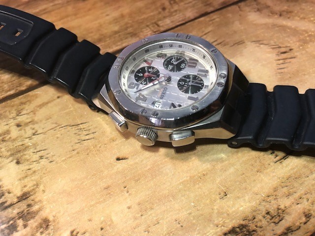 AK482 レア ヴィンテージ GUESS ゲス STEEL クロノグラフ デイト シルバー l12018G2 ラバーベルト クオーツ メンズ 腕時計