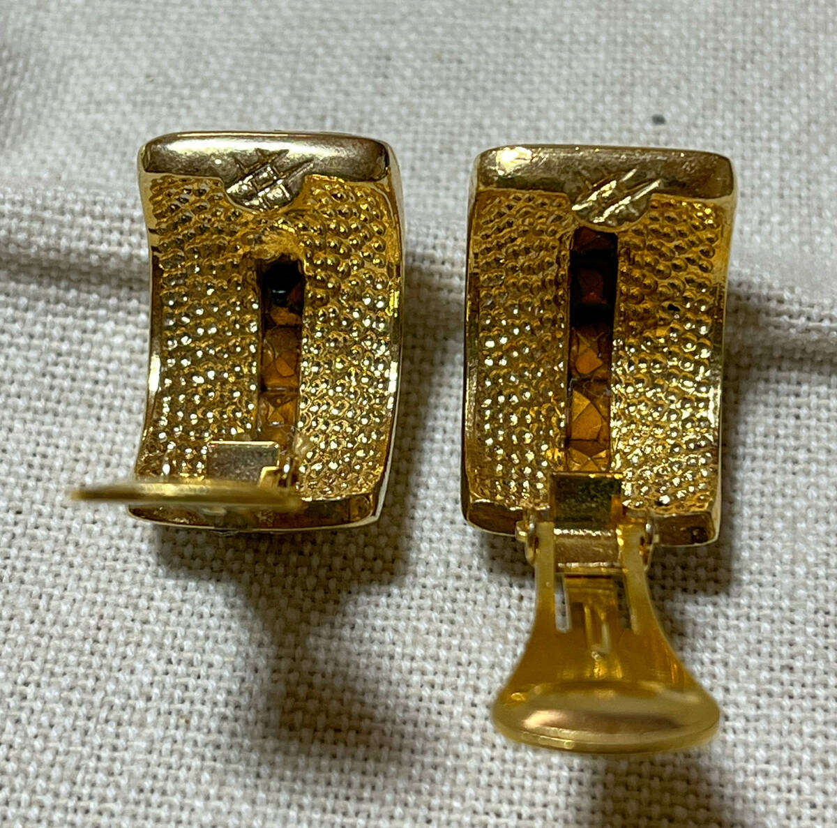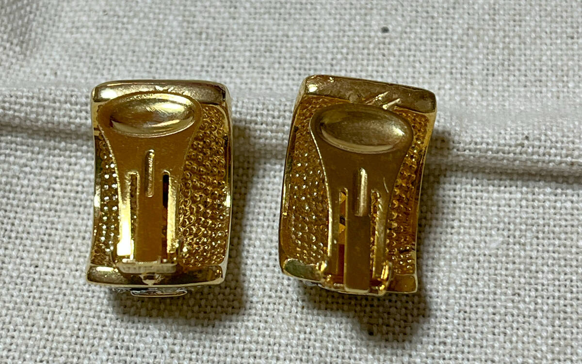 長方形でアーチ状になったベースに3列石をあしらってあります。大ぶりでゴージャスなイヤリングです。