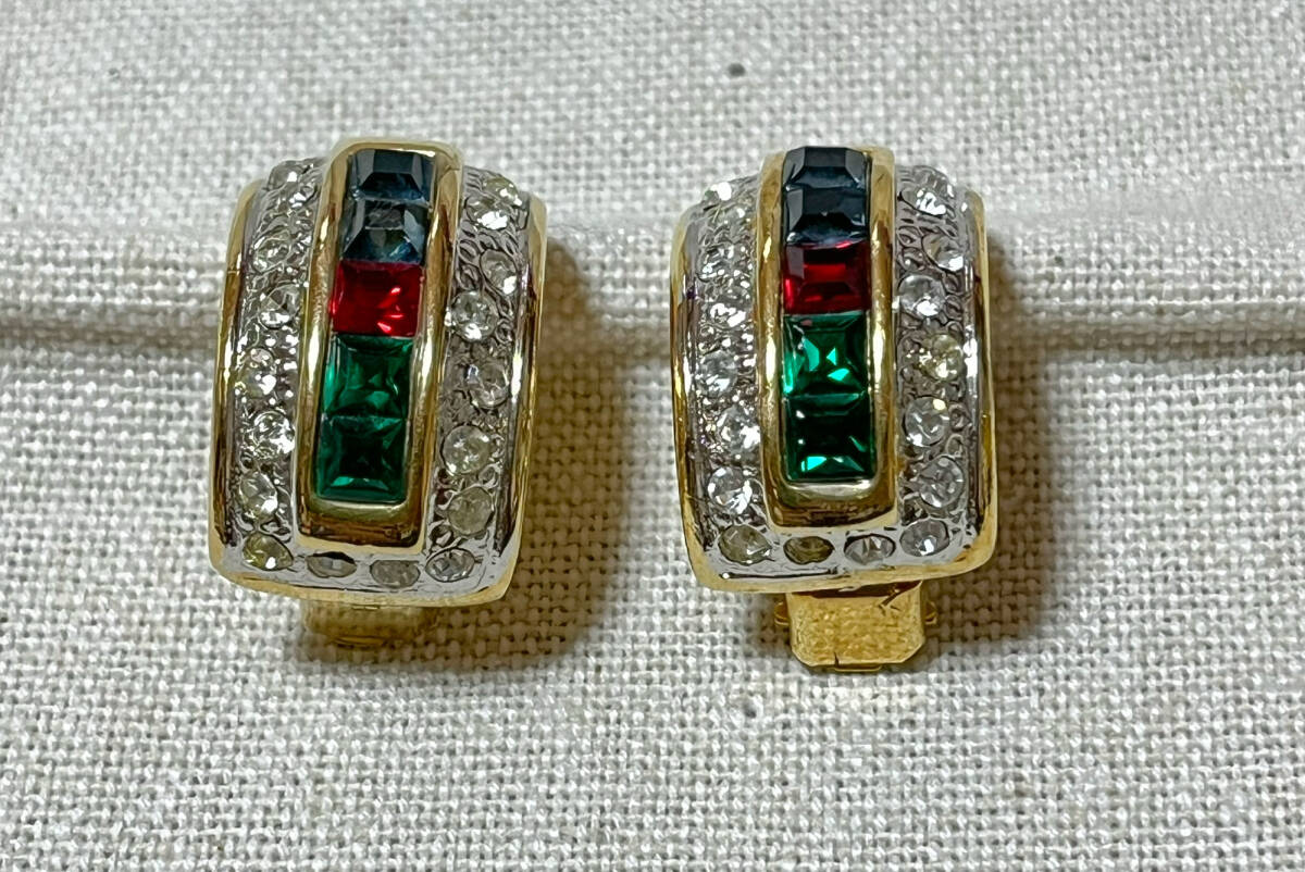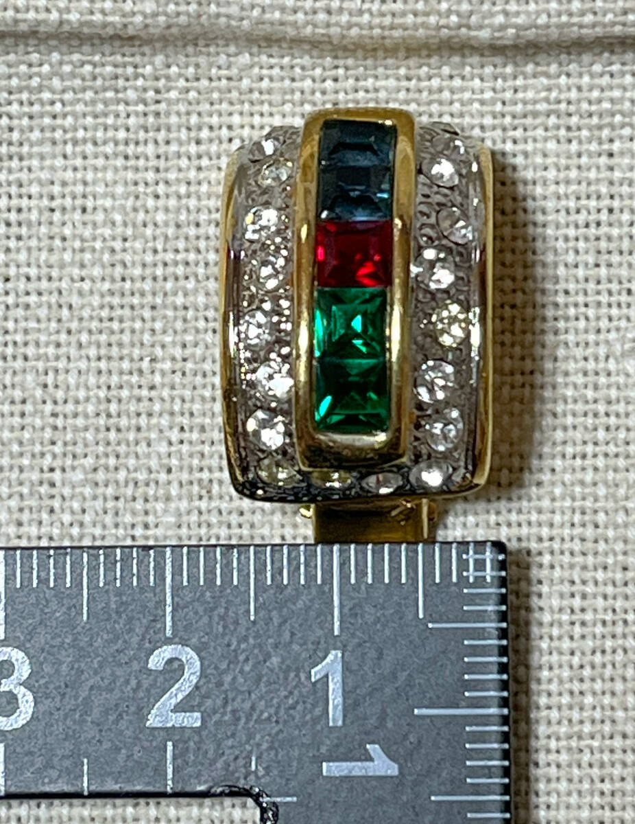 アンティーク スクエア アーチ イヤリング 両耳揃い ゴールドカラーベース×メレダイヤ風×ブルー×レッド×グリーン 3ライン ヴィンテージ