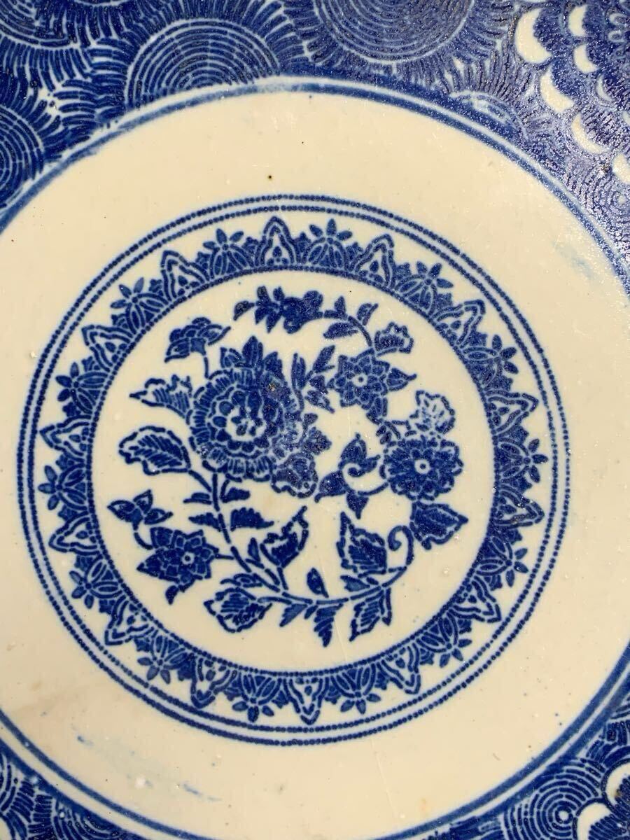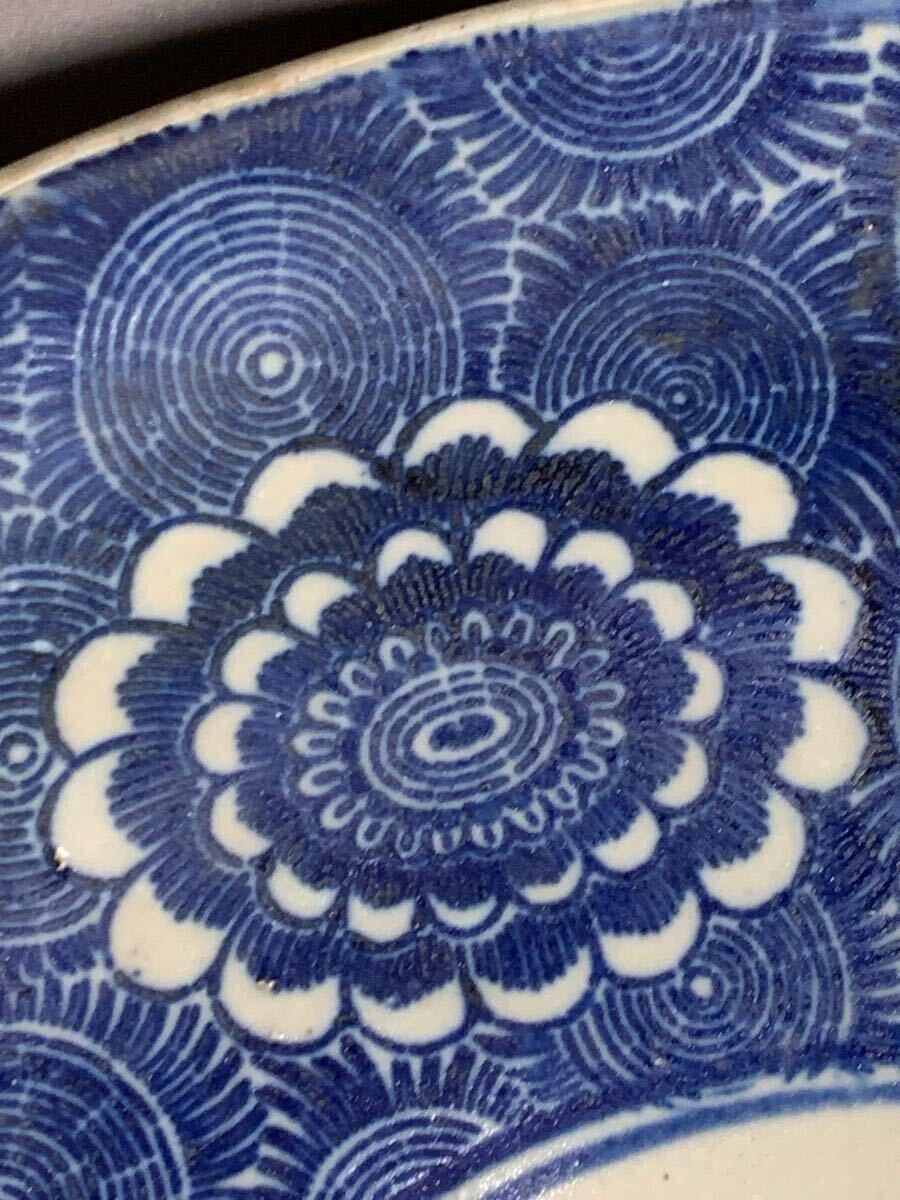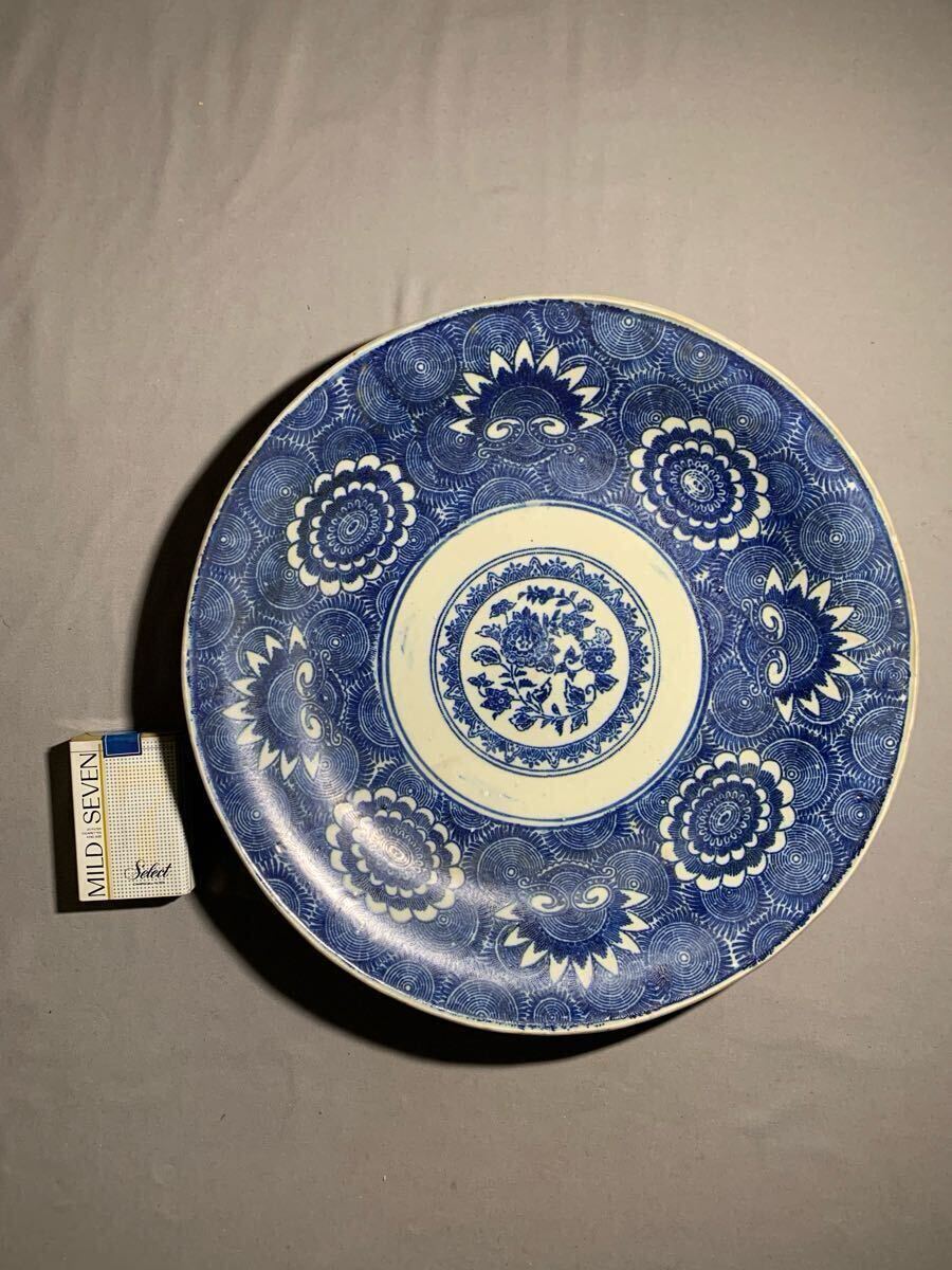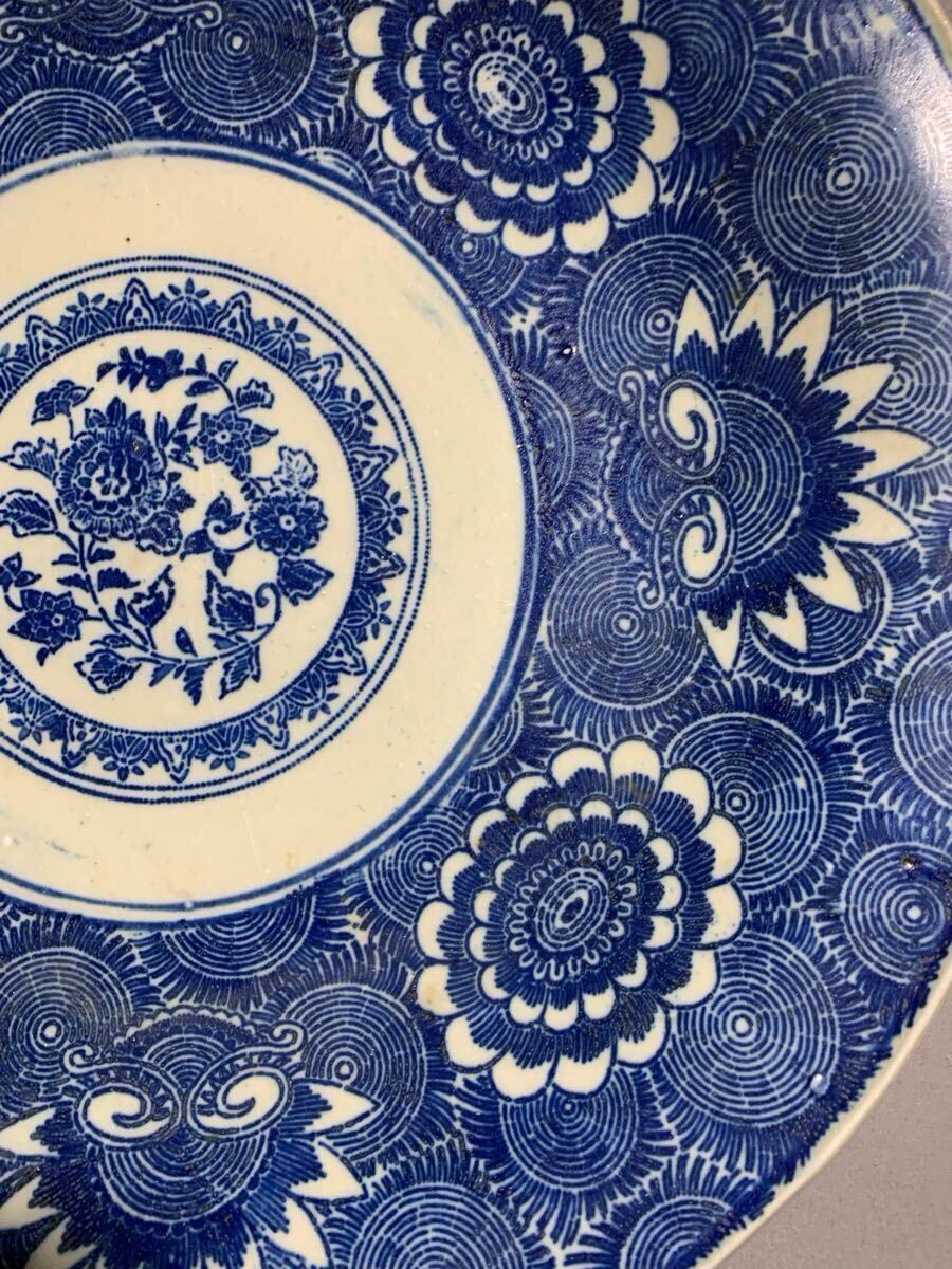 生活印判 染付渦中花弁大皿。大きさは、口径約35.8〜36.4センチ×高さ約4.5〜5.3センチ。高台に薄っすらニューあります、表にはありません(写真10参照)。落札後はノンクレームでお願いします。