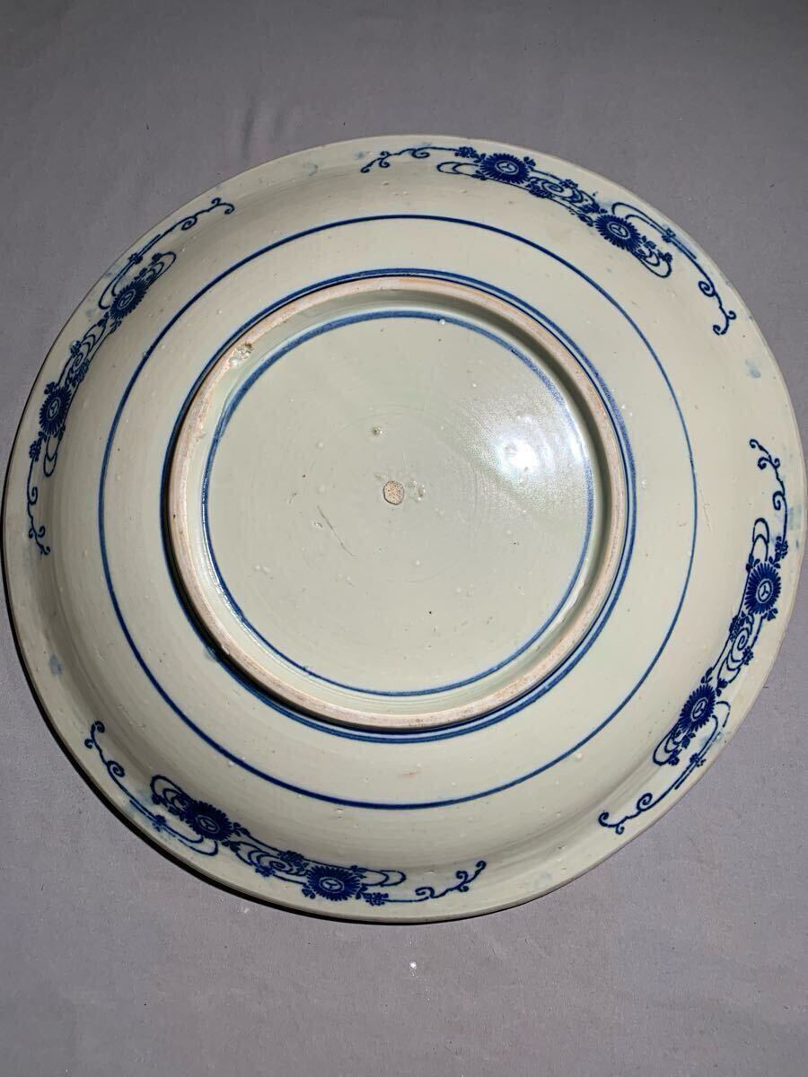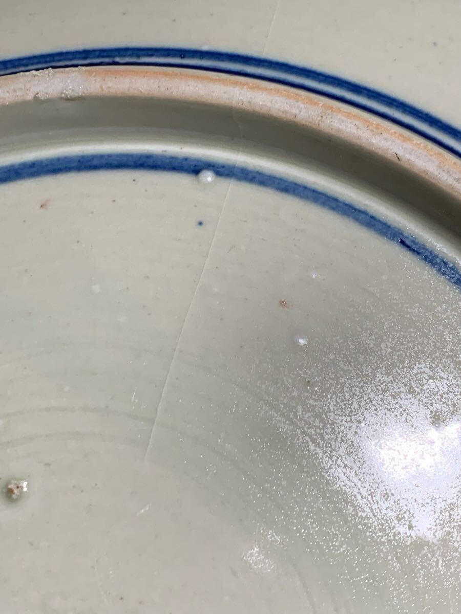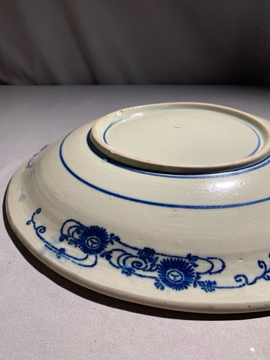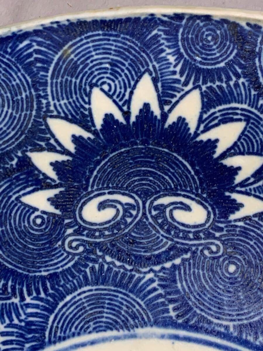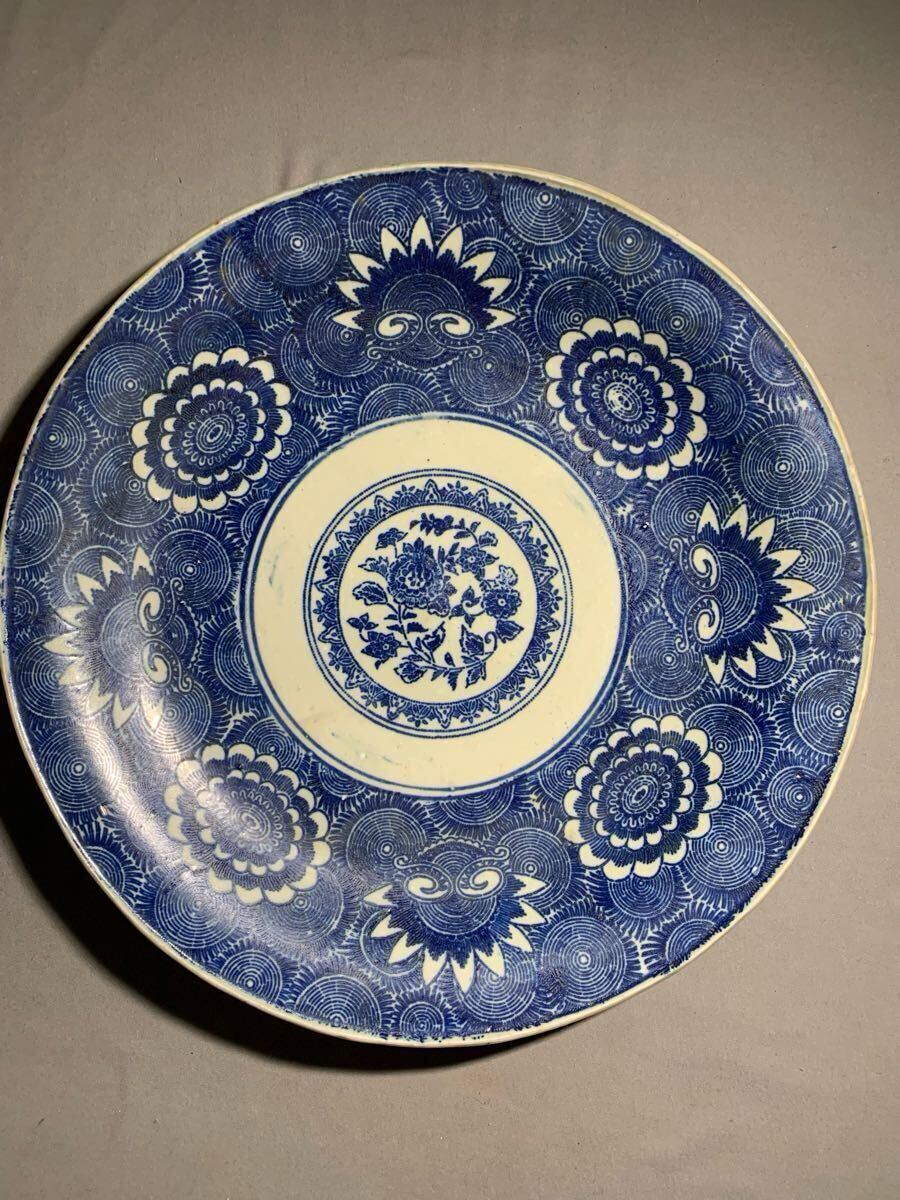生活印判 染付渦中花弁大皿。大きさは、口径約35.8〜36.4センチ×高さ約4.5〜5.3センチ。高台に薄っすらニューあります、表にはありません(写真10参照)。落札後はノンクレームでお願いします。