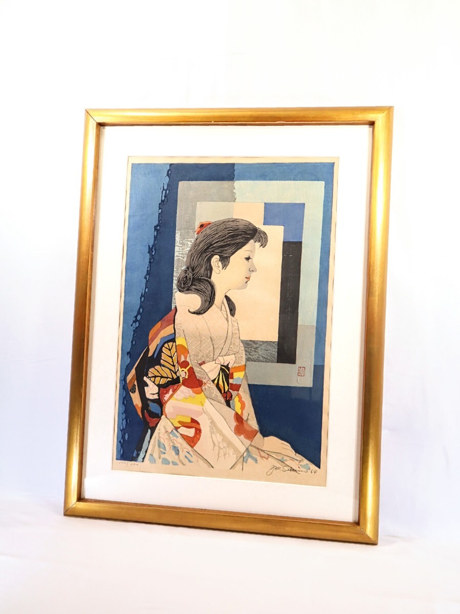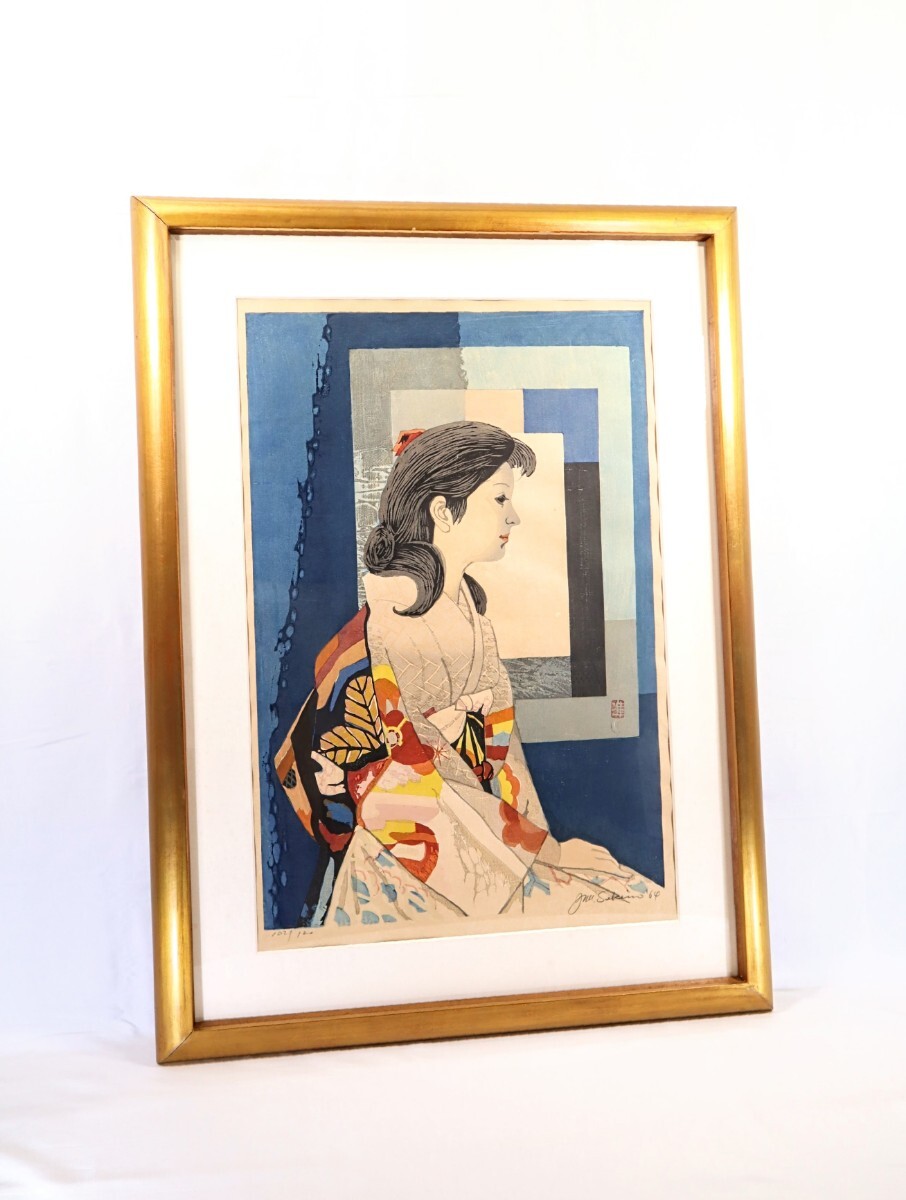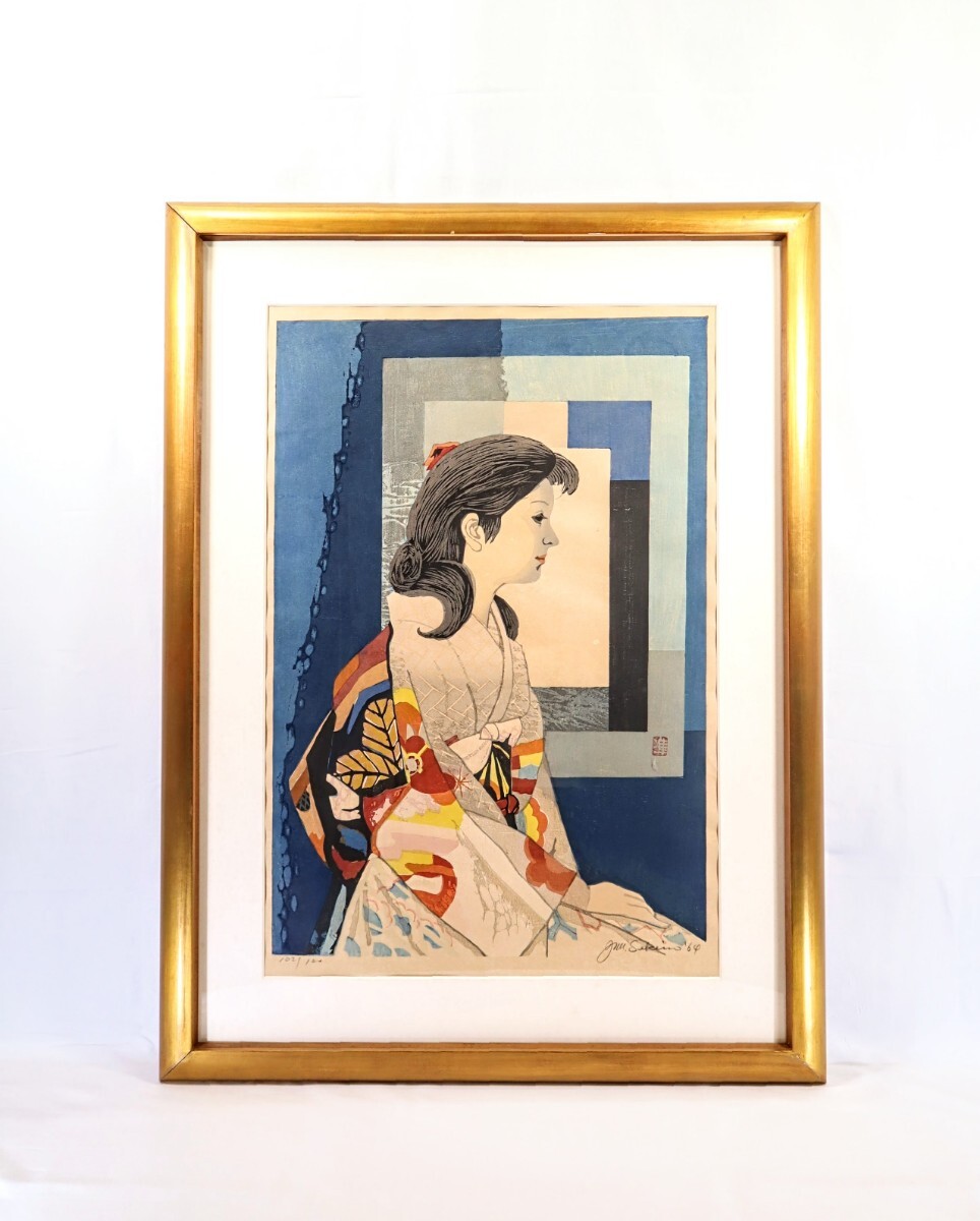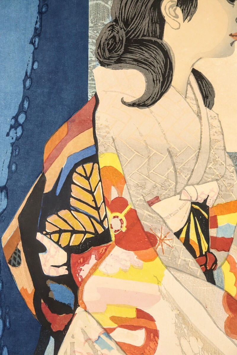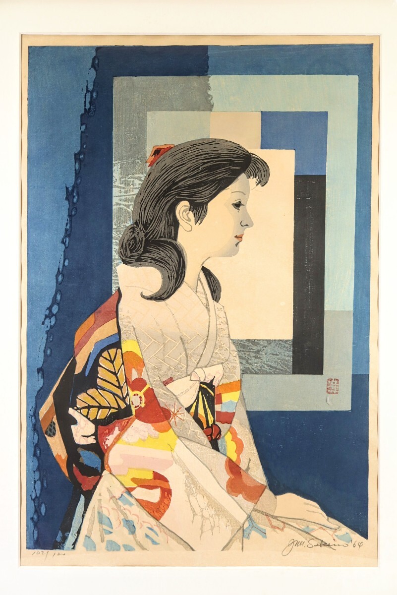 真作 関野凖一郎 1964年大判木版画「鮎子」画56×81.5cm 青森県出身 現代の浮世絵師 大胆な色彩感覚と巧みな幾何学的画面構成 準一郎 10514